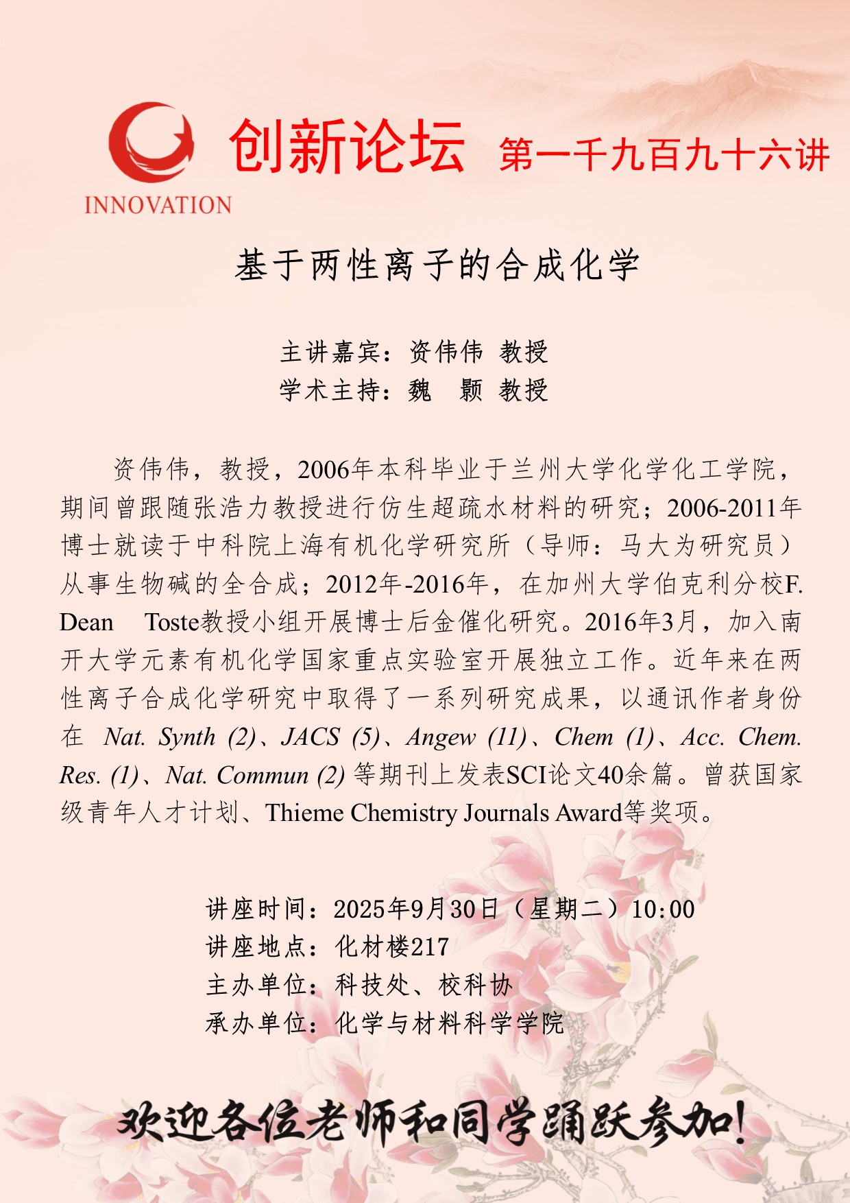 资伟伟 教授 日日躁夜夜躁狠狠久久AV创新论坛第一千九百九十六讲: 基于两性离子的合成化学 讲座时间 2025年9月30日(星期二)10:00 讲座地点 化材楼217 讲座人介绍 资伟伟 教授 讲座内容
