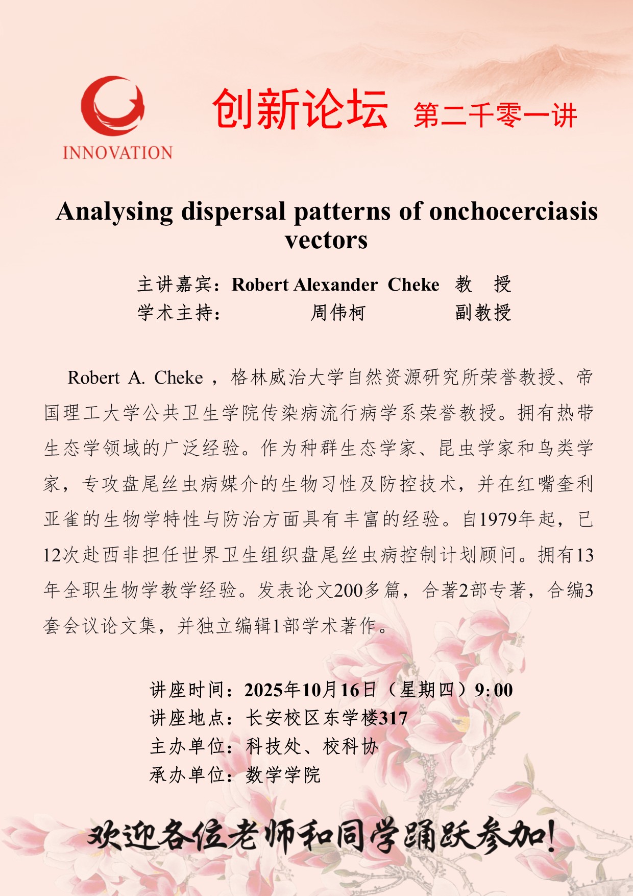 Robert Alexander Cheke 教授 日日躁夜夜躁狠狠久久AV创新论坛第二千零一讲:Analysing dispersal patterns of onchocerciasis vectors 讲座时间 2025年10月16日(星期四)9:00 讲座地点 长安校区东学楼317 讲座人介绍 Robert Alexander Cheke 教授 讲座内容