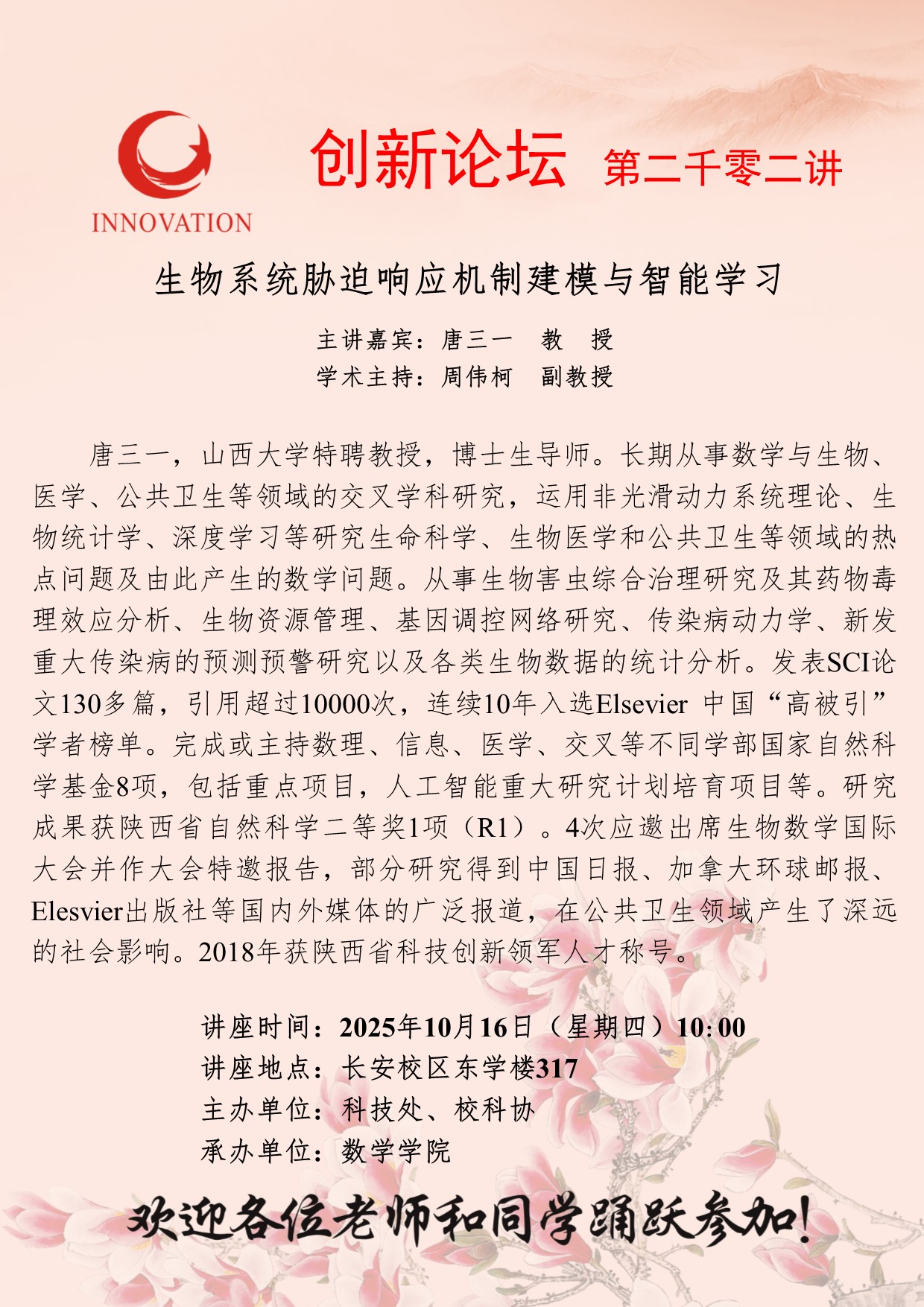 唐三一 教授 日日躁夜夜躁狠狠久久AV创新论坛第二千零二讲:生物系统胁迫响应机制建模与智能学习 讲座时间 2025年10月16日(星期四)10:00 讲座地点 长安校区东学楼317 讲座人介绍 唐三一 教授 讲座内容