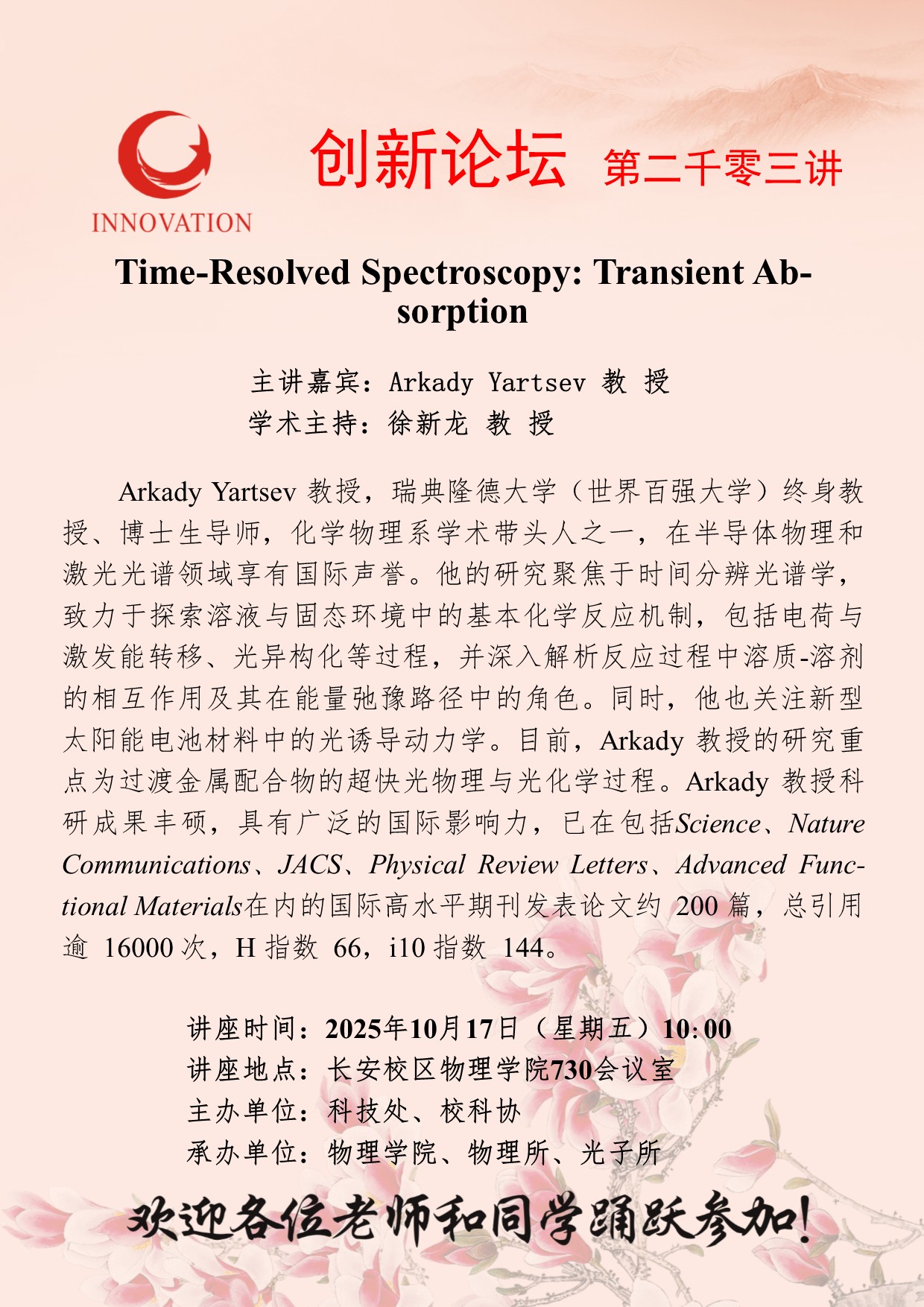 Arkady Yartsev 教授 日日躁夜夜躁狠狠久久AV创新论坛第二千零三讲:Time-Resolved Spectroscopy: Transient Absorption 讲座时间 2025年10月17日(星期五)10:00 讲座地点 长安校区物理学院730会议室 讲座人介绍 Arkady Yartsev 教授 讲座内容