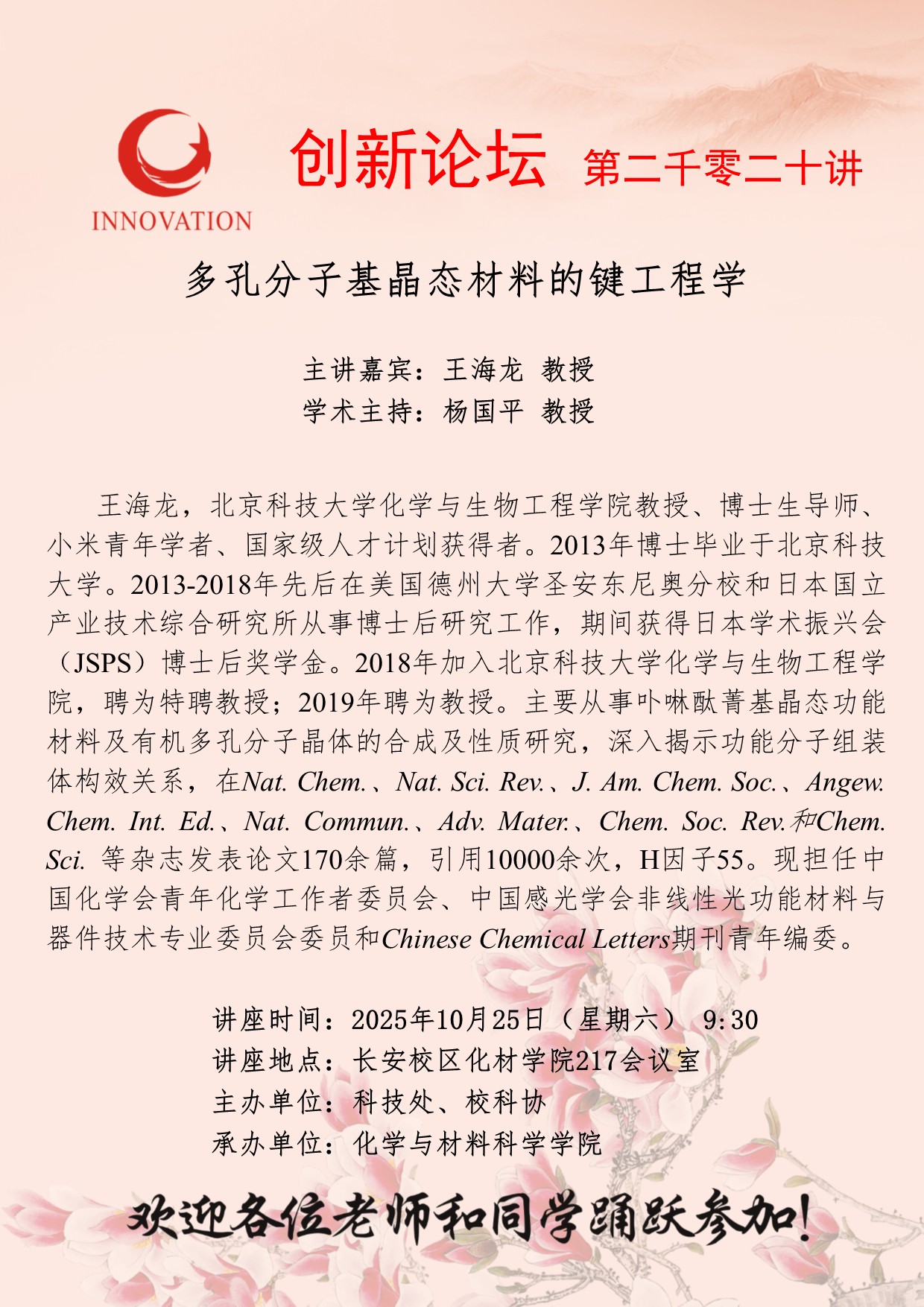 王海龙 教授 日日躁夜夜躁狠狠久久AV创新论坛第二千零二十讲:多孔分子基晶态材料的键工程学 讲座时间 2025年10月25日(星期六) 9:30 讲座地点 长安校区化材学院217会议室 讲座人介绍 王海龙 教授 讲座内容