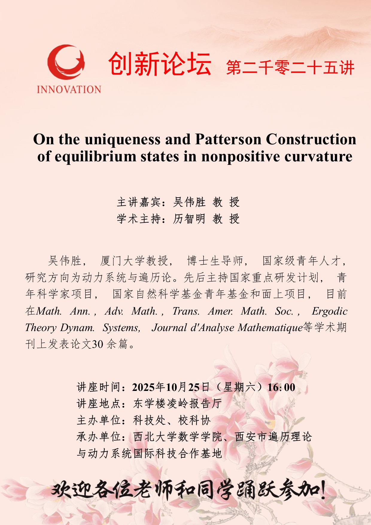吴伟胜 教 授 日日躁夜夜躁狠狠久久AV创新论坛第二千零二十五讲:On the uniqueness and Patterson Construction of equilibrium states in nonpositive curvature 讲座时间 2025年10月25日(星期六)16:00 讲座地点 东学楼凌岭报告厅 讲座人介绍 吴伟胜 教 授 讲座内容