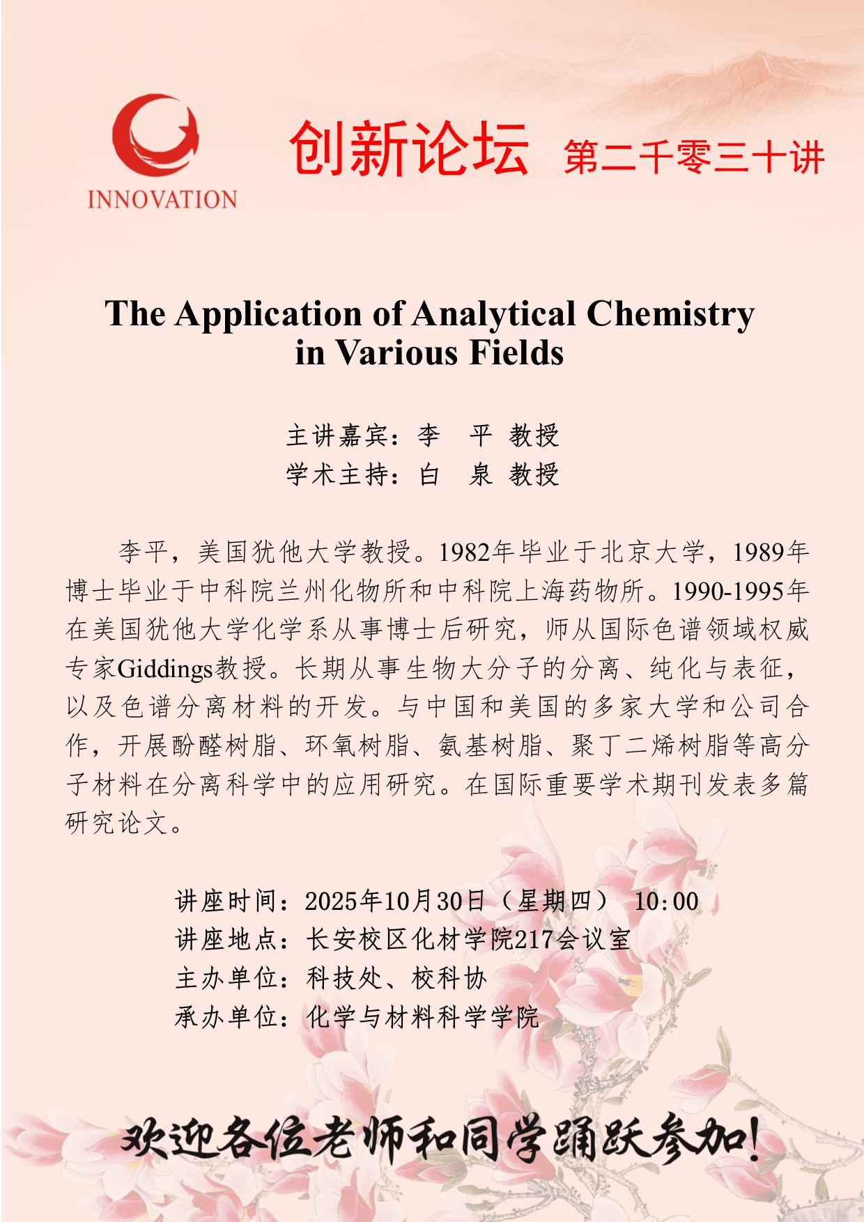 李 平 教授 日日躁夜夜躁狠狠久久AV创新论坛第二千零三十讲:The Application of Analytical Chemistry in Various Fields 讲座时间 2025年10月30日(星期四) 10:00 讲座地点 长安校区化材学院217会议室 讲座人介绍 李 平 教授 讲座内容