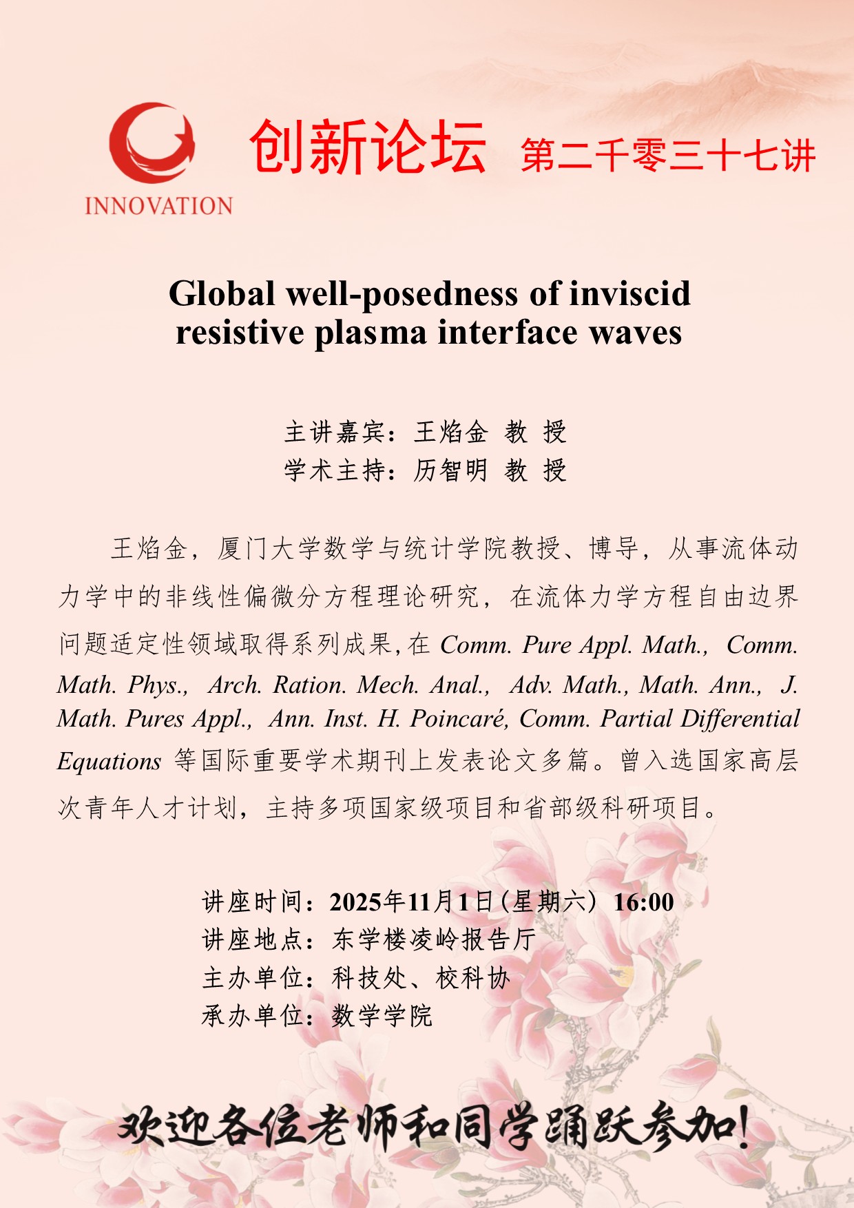 王焰金 教 授 日日躁夜夜躁狠狠久久AV创新论坛第二千零三十七讲:Global well-posedness of inviscid resistive plasma interface waves 讲座时间 2025年11月1日(星期六) 16:00 讲座地点 东学楼凌岭报告厅 讲座人介绍 王焰金 教 授 讲座内容