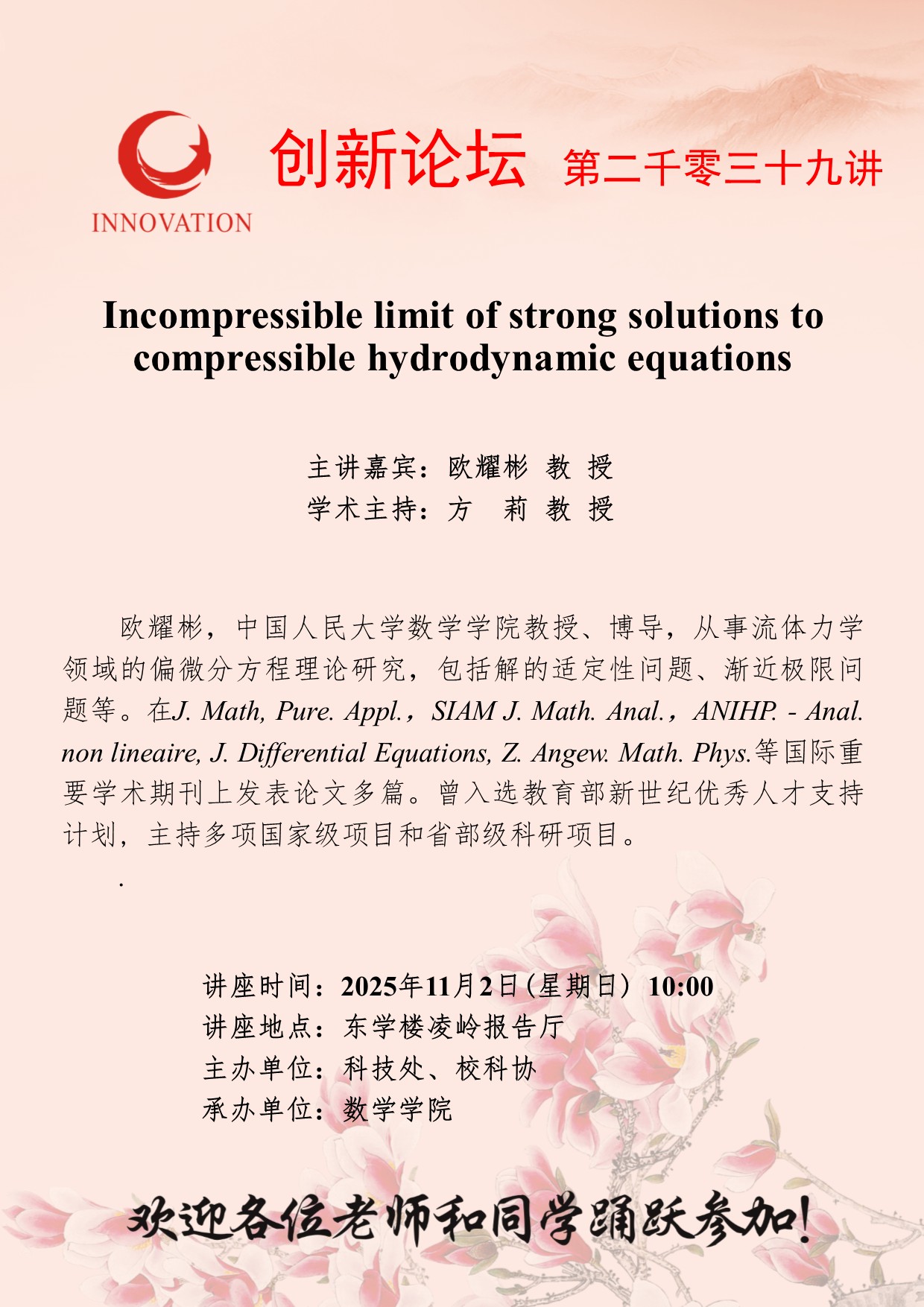 欧耀彬 教 授 日日躁夜夜躁狠狠久久AV创新论坛第二千零三十九讲:Incompressible limit of strong solutions to compressible hydrodynamic equations 讲座时间 2025年11月2日(星期日) 10:00 讲座地点 东学楼凌岭报告厅 讲座人介绍 欧耀彬 教 授 讲座内容
