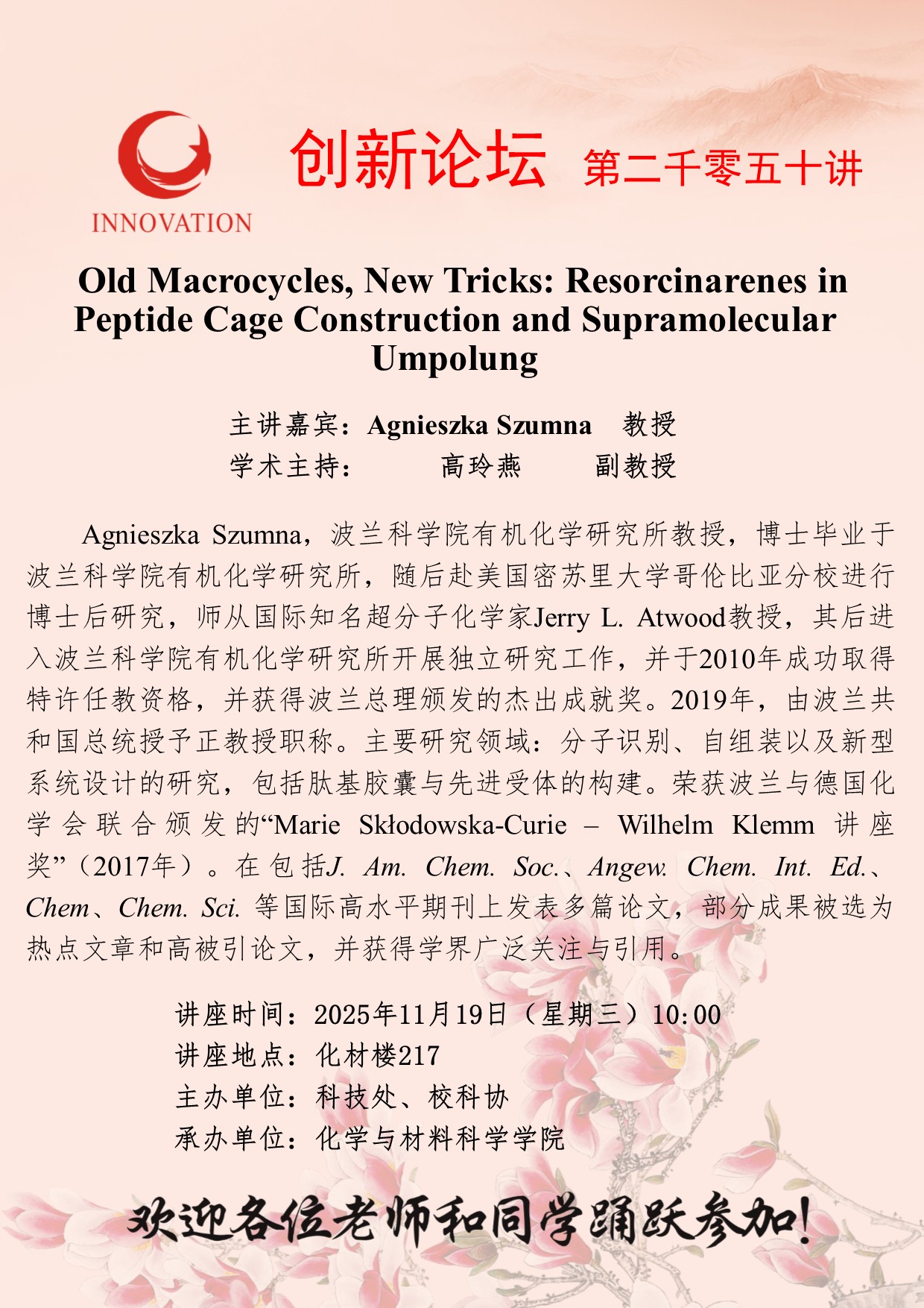 Agnieszka Szumna 教授 日日躁夜夜躁狠狠久久AV创新论坛第二千零五十讲:Old Macrocycles, New Tricks: Resorcinarenes in Peptide Cage Construction and Supramolecular Umpolung 讲座时间 2025年11月19日(星期三)10:00 讲座地点 化材楼217 讲座人介绍 Agnieszka Szumna 教授 讲座内容