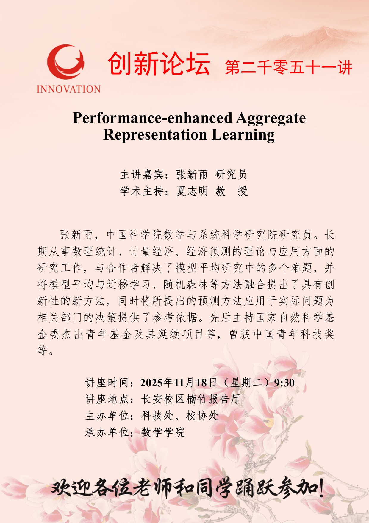 张新雨 研究员 日日躁夜夜躁狠狠久久AV创新论坛第二千零五十一讲:Performance-enhanced Aggregate Representation Learning 讲座时间 2025年11月18日(星期二)9:30 讲座地点 长安校区楠竹报告厅 讲座人介绍 张新雨 研究员 讲座内容
