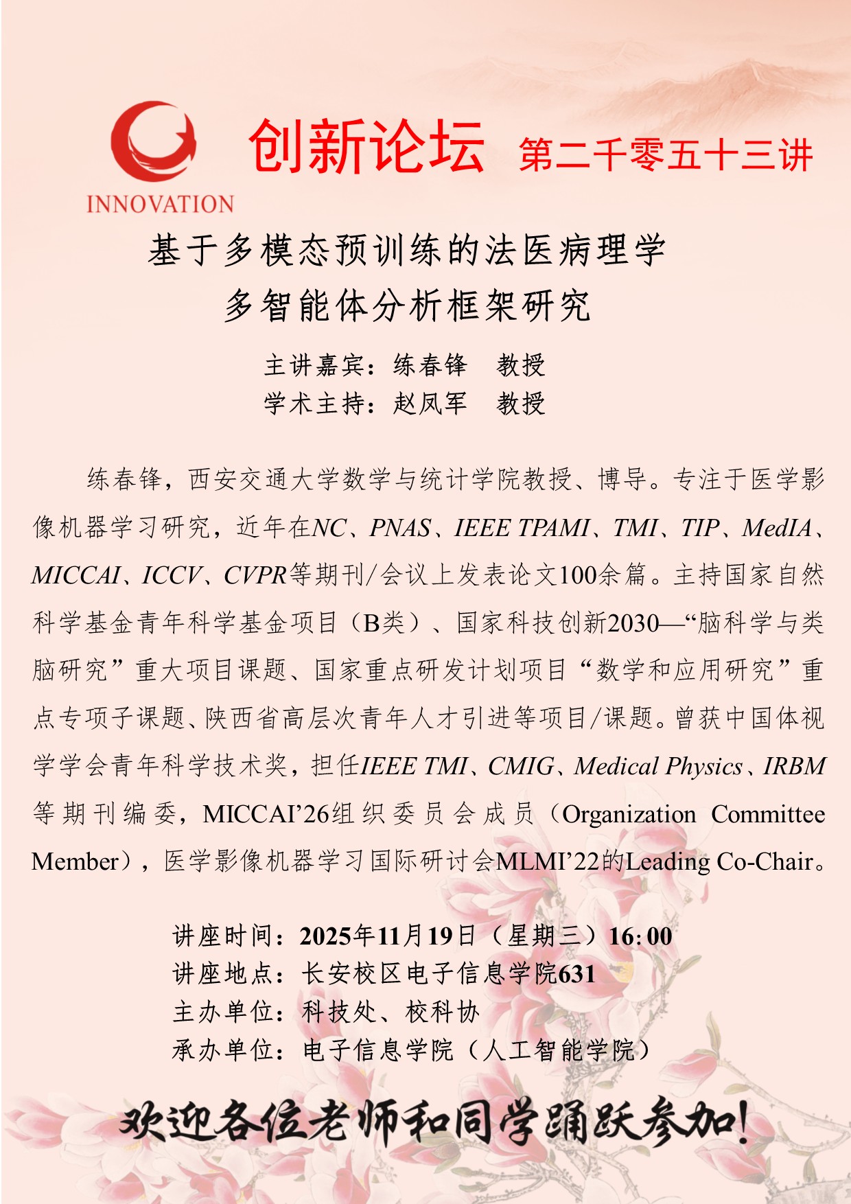练春锋 教授 日日躁夜夜躁狠狠久久AV创新论坛第二千零五十三讲:基于多模态预训练的法医病理学多智能体分析框架研究 讲座时间 2025年11月19日(星期三)16:00 讲座地点 长安校区电子信息学院631 讲座人介绍 练春锋 教授 讲座内容