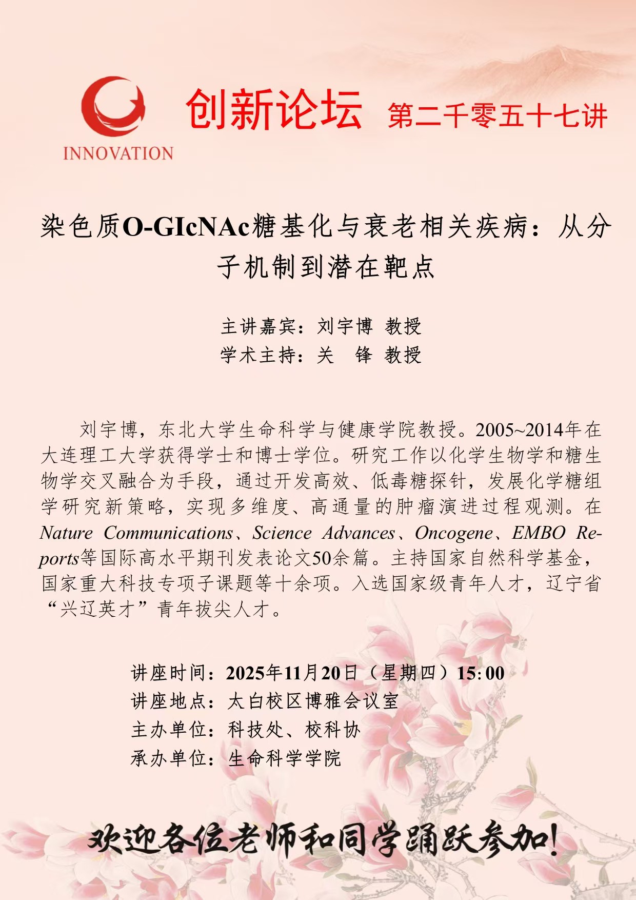 刘宇博 教授 日日躁夜夜躁狠狠久久AV创新论坛第二千零五十七讲:染色质O-GIcNAc糖基化与衰老相关疾病:从分子机制到潜在靶点 讲座时间 2025年11月20日(星期四)15:00 讲座地点 太白校区博雅会议室 讲座人介绍 刘宇博 教授 讲座内容