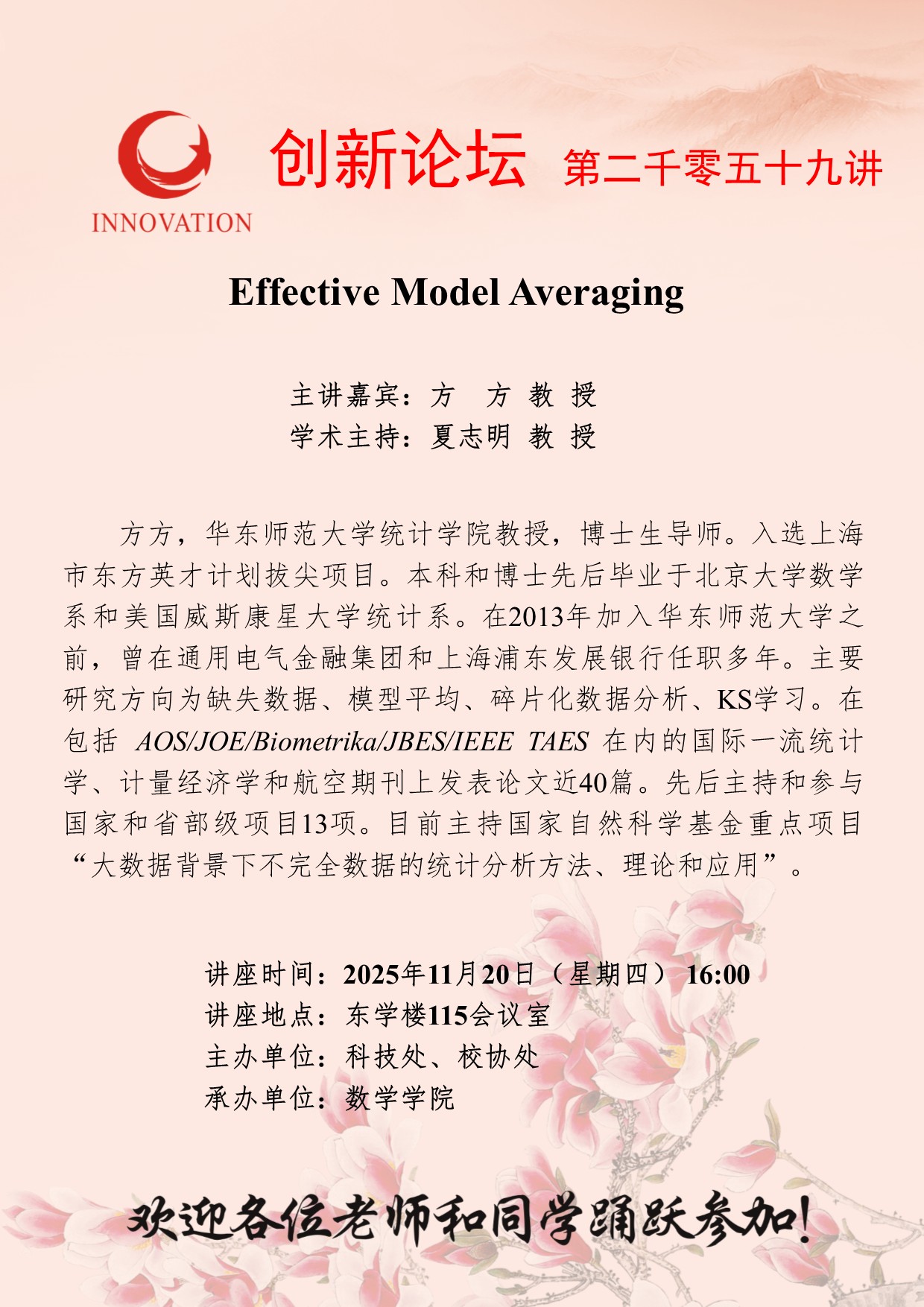 方方 教授 日日躁夜夜躁狠狠久久AV创新论坛第二千零五十九讲:Effective Model Averaging 讲座时间 2025年11月20日(星期四) 16:00 讲座地点 东学楼115会议室 讲座人介绍 方方 教授 讲座内容