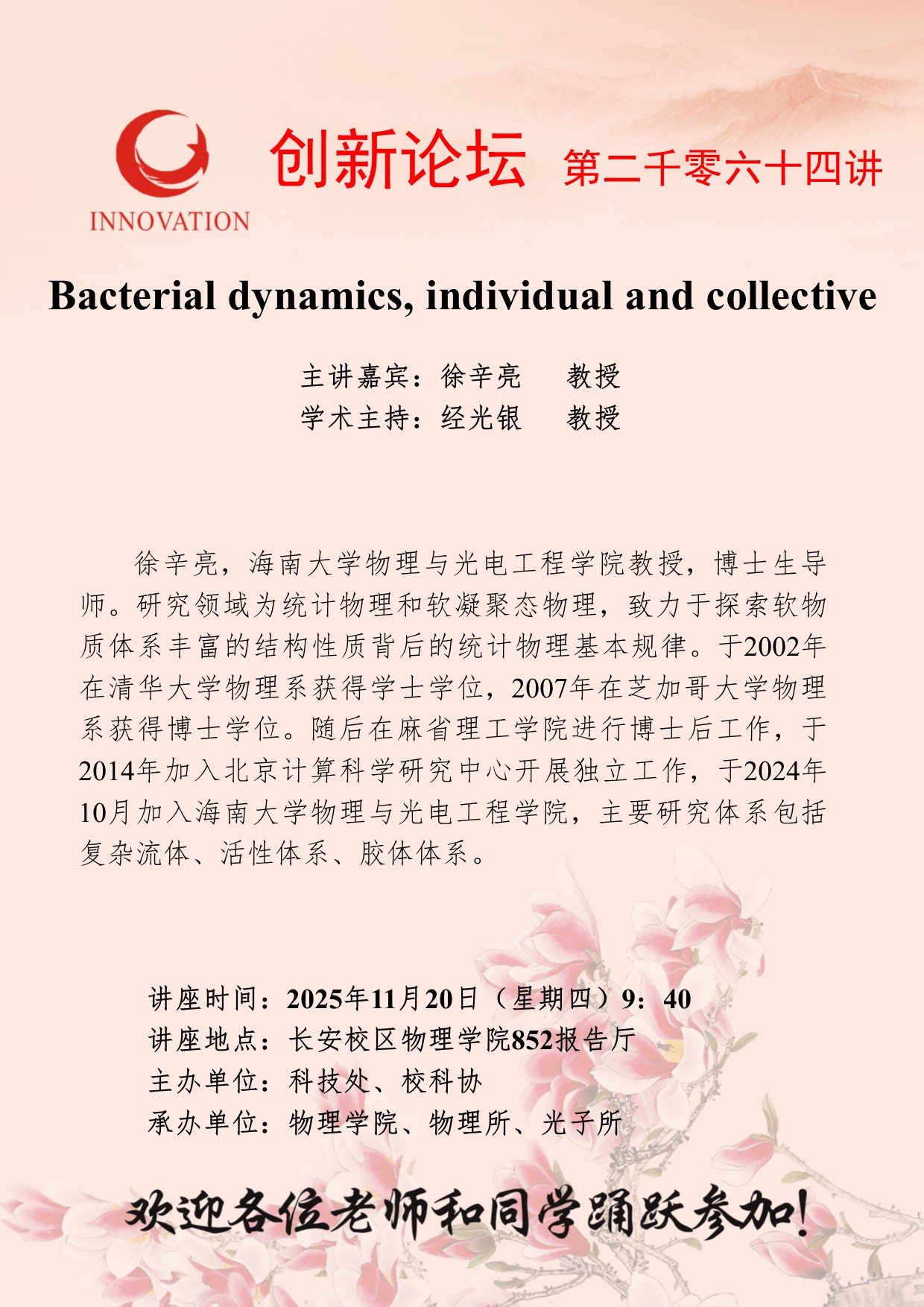 徐辛亮 教授 日日躁夜夜躁狠狠久久AV创新论坛第二千零六十四讲:Bacterial dynamics, individual and collective 讲座时间 2025年11月20日(星期四)9:40 讲座地点 长安校区物理学院852报告厅 讲座人介绍 徐辛亮 教授 讲座内容