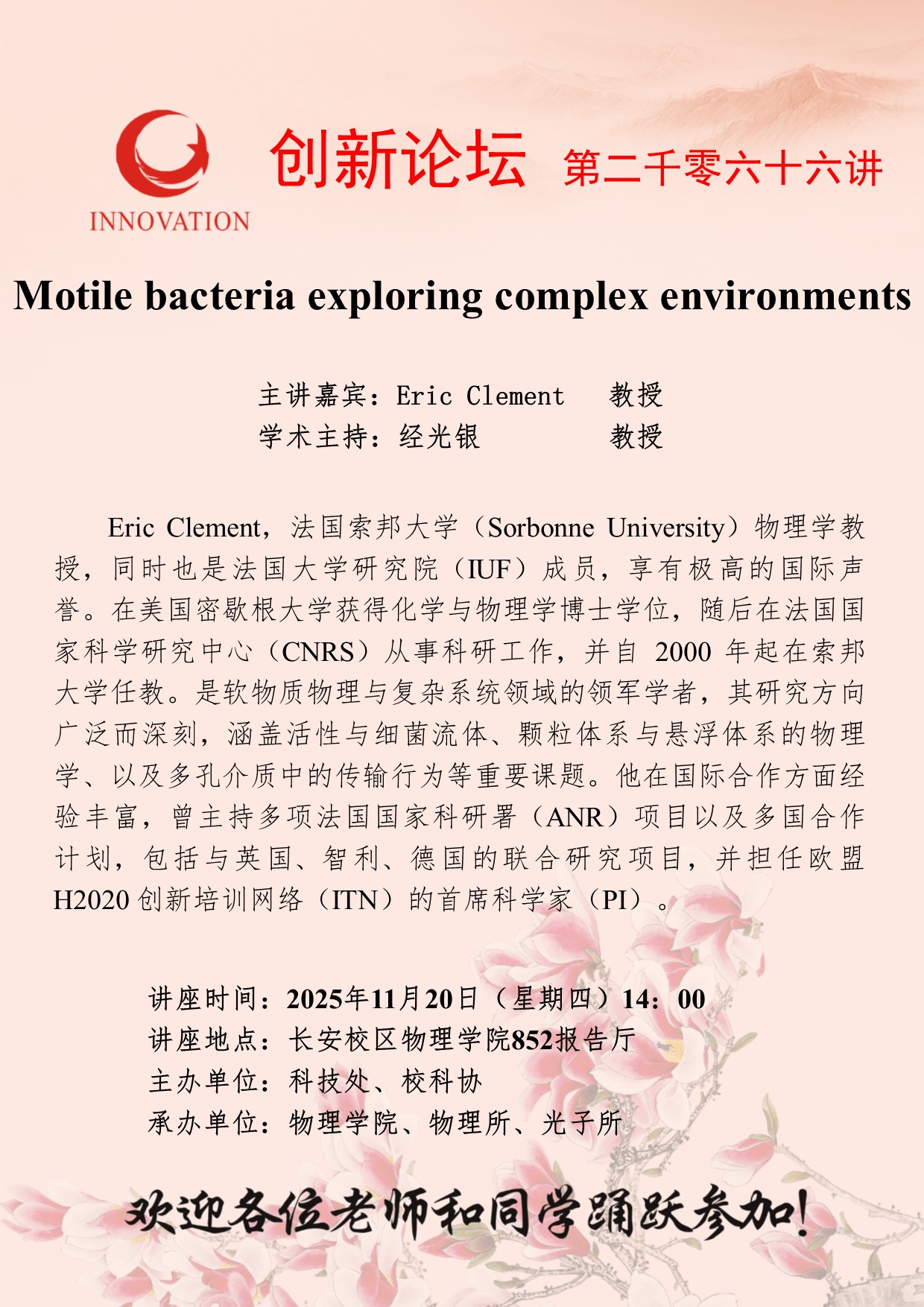 Eric Clement 教授 日日躁夜夜躁狠狠久久AV创新论坛第二千零六十六讲:Motile bacteria exploring complex environments 讲座时间 2025年11月20日(星期四)14:00 讲座地点 长安校区物理学院852报告厅 讲座人介绍 Eric Clement 教授 讲座内容