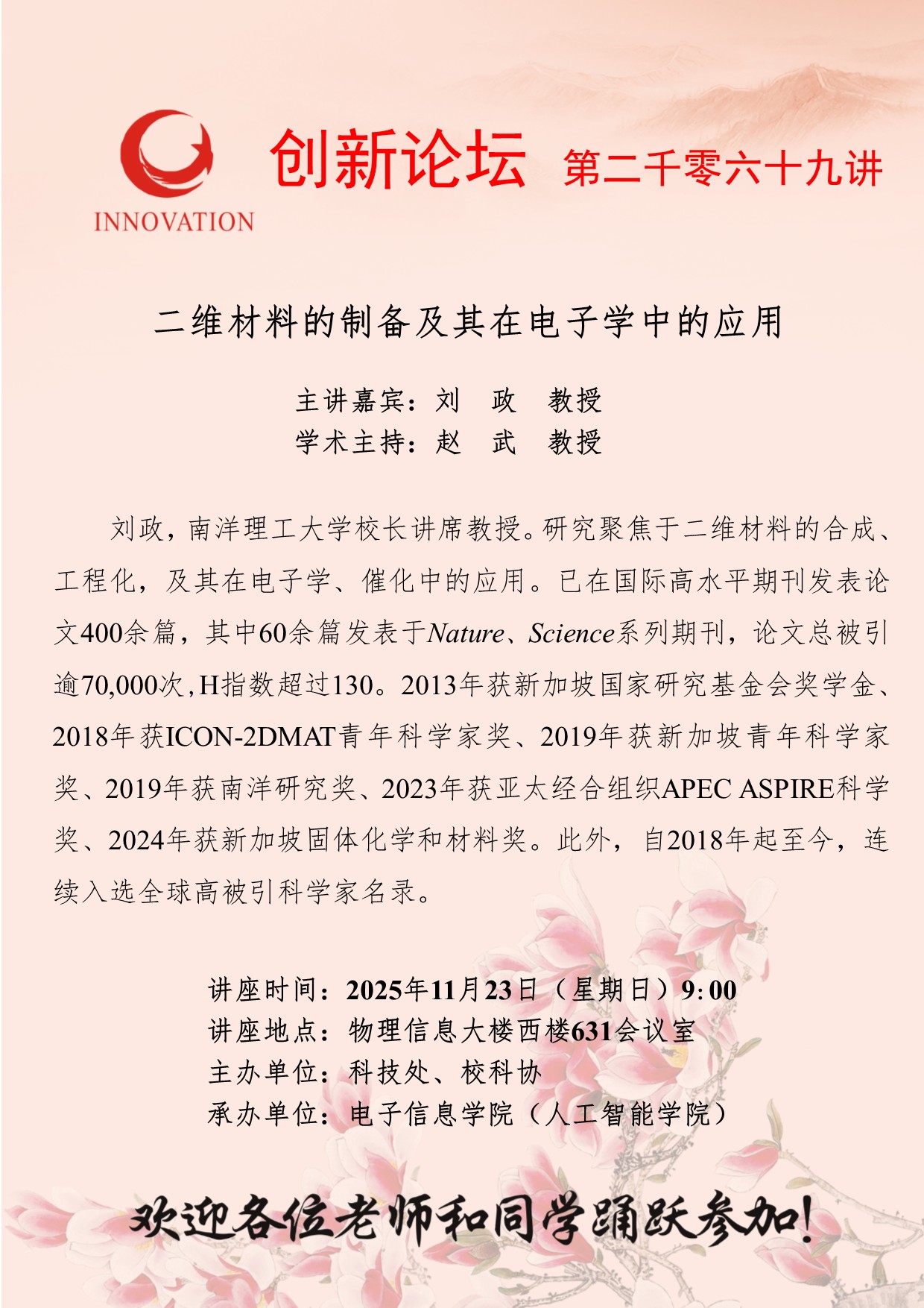 刘政 教授 日日躁夜夜躁狠狠久久AV创新论坛第二千零六十九讲:二维材料的制备及其在电子学中的应用 讲座时间 2025年11月23日(星期日)9:00 讲座地点 物理信息大楼西楼631会议室 讲座人介绍 刘政 教授 讲座内容