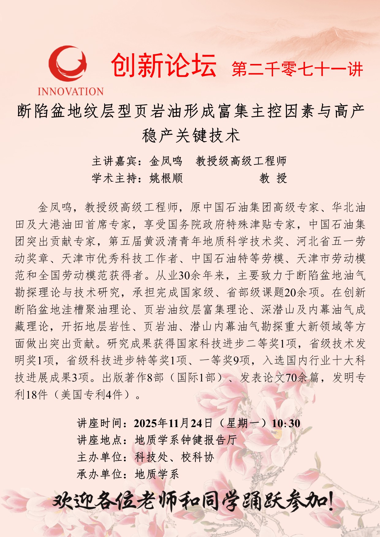 金凤鸣 教授级高级工程师 日日躁夜夜躁狠狠久久AV创新论坛第二千零七十一讲:断陷盆地纹层型页岩油形成富集主控因素与高产稳产关键技术 讲座时间 2025年11月24日(星期一)10:30 讲座地点 地质学系钟健报告厅 讲座人介绍 金凤鸣 教授级高级工程师 讲座内容