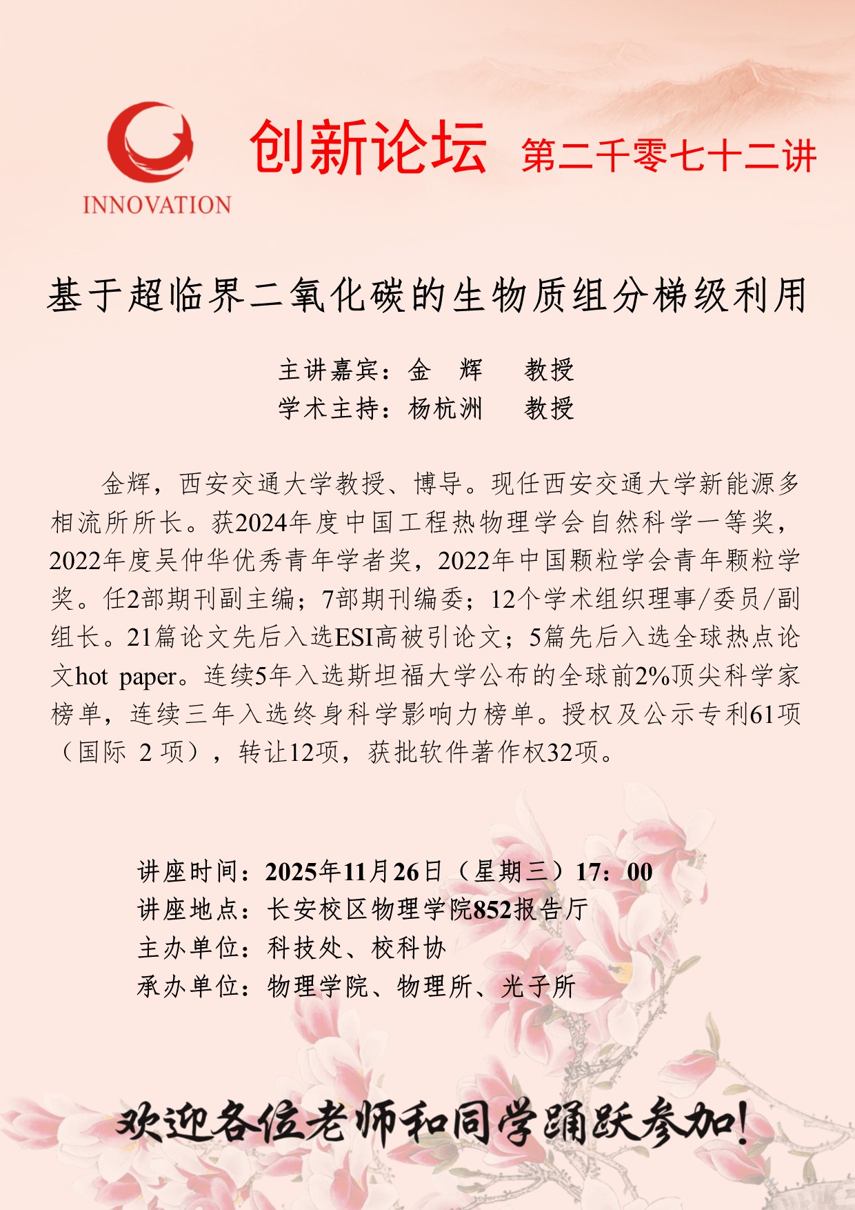 金辉 教授 日日躁夜夜躁狠狠久久AV创新论坛第二千零七十二讲:基于超临界二氧化碳的生物质组分梯级利用 讲座时间 2025年11月26日(星期三)17:00 讲座地点 长安校区物理学院852报告厅 讲座人介绍 金辉 教授 讲座内容