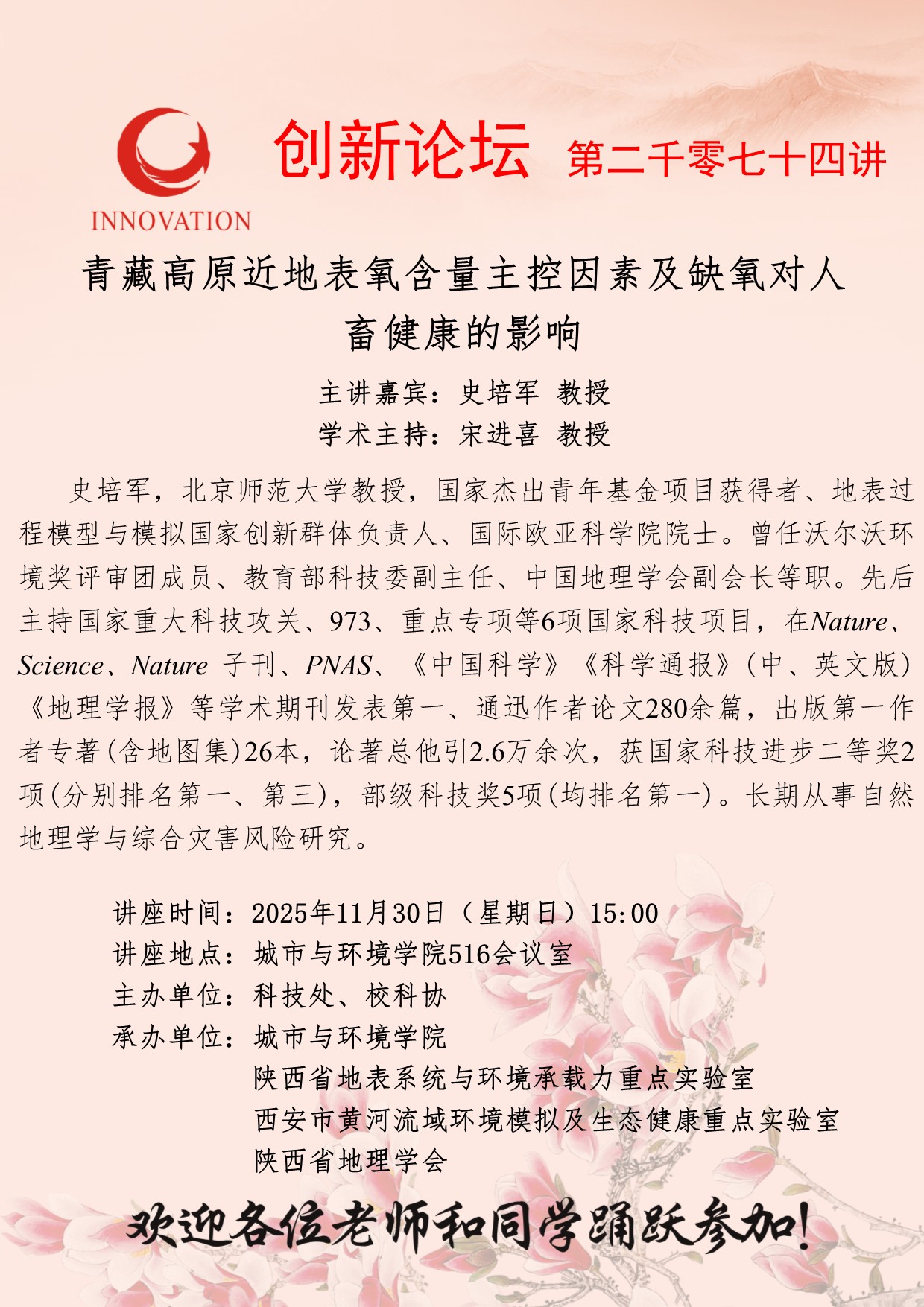 史培军 教授 日日躁夜夜躁狠狠久久AV创新论坛第二千零七十四讲:青藏高原近地表氧含量主控因素及缺氧对人畜健康的影响 讲座时间 2025年11月30日(星期日)15:00 讲座地点 城市与环境学院516会议室 讲座人介绍 史培军 教授 讲座内容