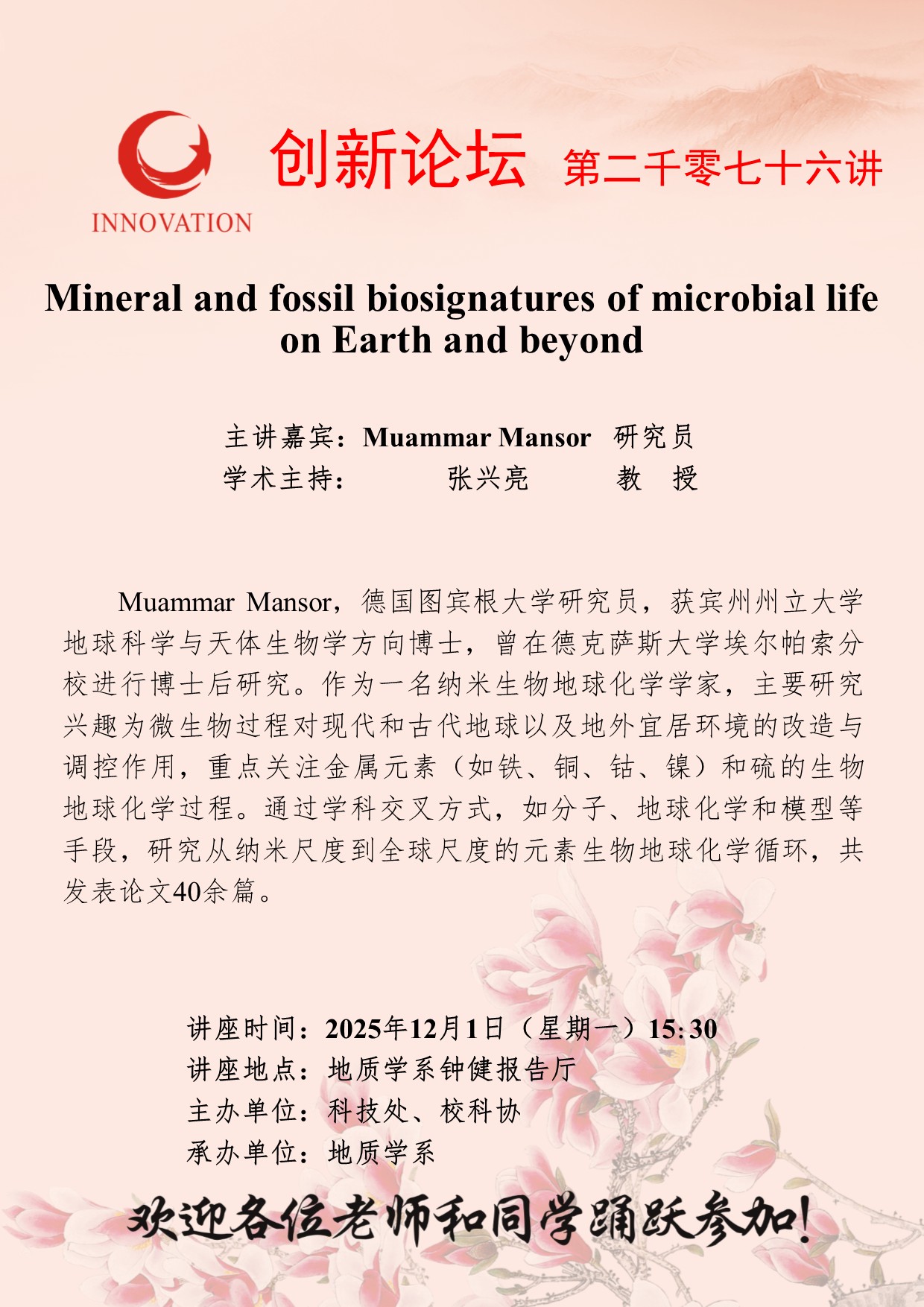 Muammar Mansor 研究员 日日躁夜夜躁狠狠久久AV创新论坛第二千零七十六讲:Mineral and fossil biosignatures of microbial life on Earth and beyond 讲座时间 2025年12月1日(星期一)15:30 讲座地点 地质学系钟健报告厅 讲座人介绍 Muammar Mansor 研究员 讲座内容