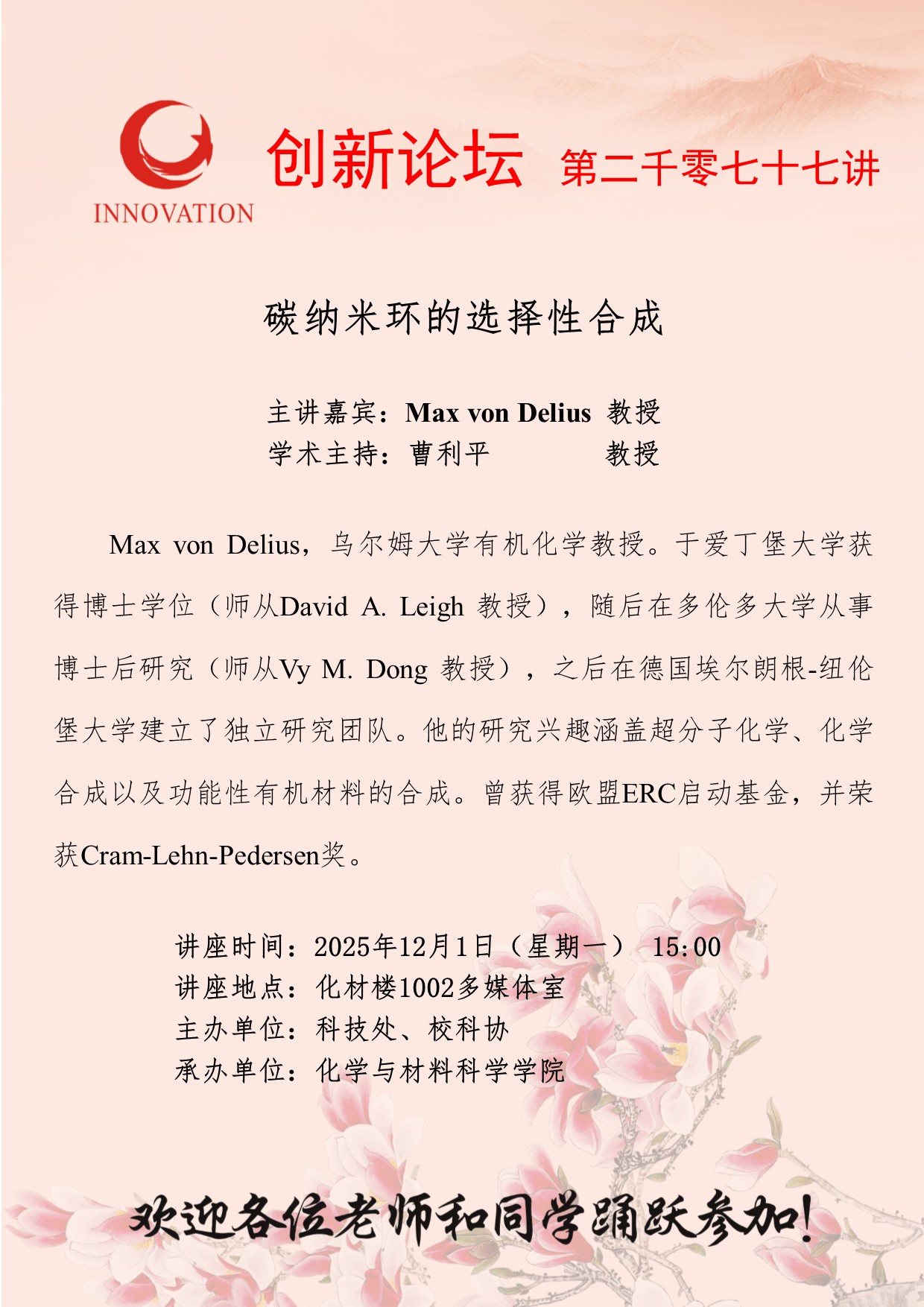 Max von Delius 教授 日日躁夜夜躁狠狠久久AV创新论坛第二千零七十七讲:碳纳米环的选择性合成 讲座时间 2025年12月1日(星期一) 15:00 讲座地点 化材楼1002多媒体室 讲座人介绍 Max von Delius 教授 讲座内容