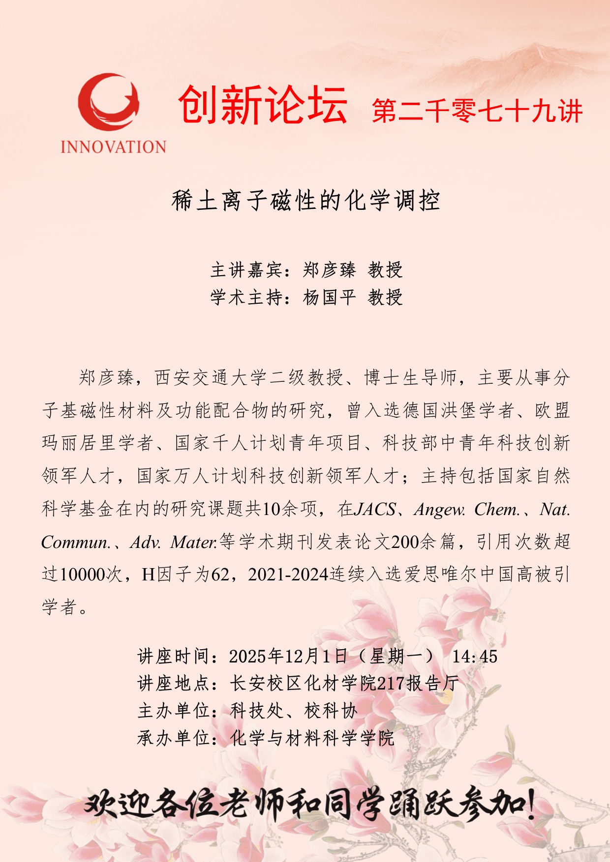 郑彦臻 教授 日日躁夜夜躁狠狠久久AV创新论坛第二千零七十九讲:稀土离子磁性的化学调控 讲座时间 2025年12月1日(星期一) 14:45 讲座地点 长安校区化材学院217报告厅 讲座人介绍 郑彦臻 教授 讲座内容