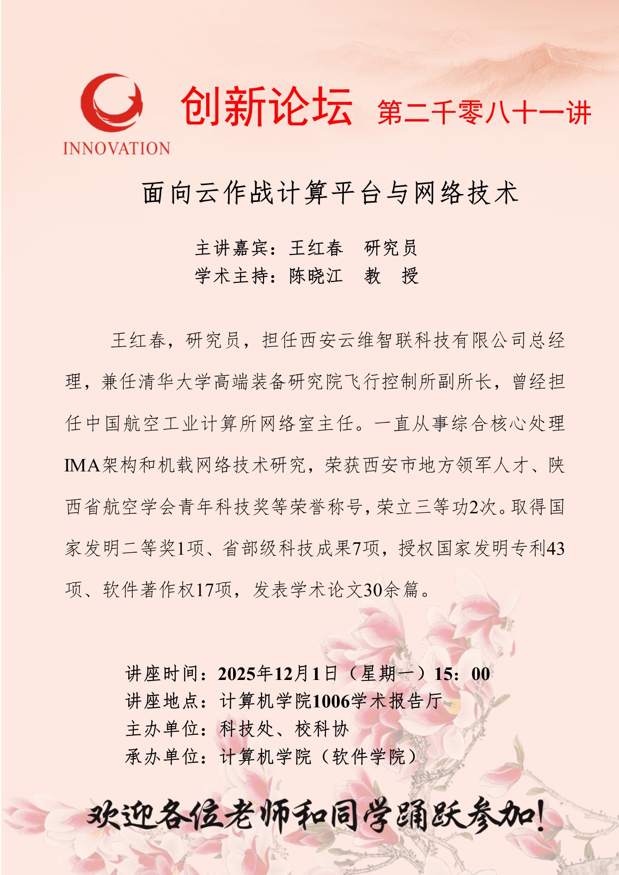 王红春 研究员 日日躁夜夜躁狠狠久久AV创新论坛第二千零八十一讲:面向云作战计算平台与网络技术 讲座时间 2025年12月1日(星期一)15:00 讲座地点 计算机学院1006学术报告厅 讲座人介绍 王红春 研究员 讲座内容