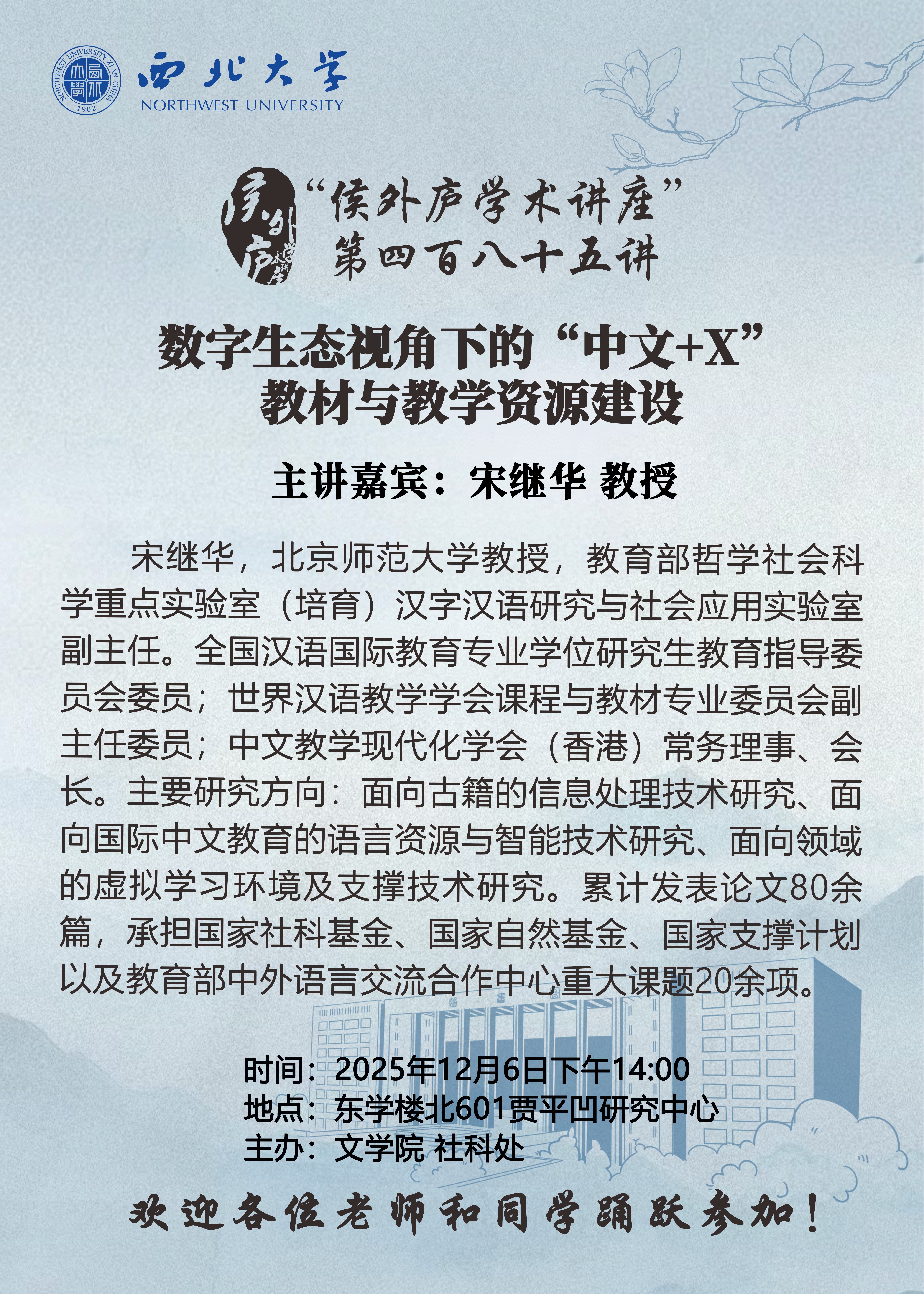 宋继华 教授 “侯外庐学术讲座” 第四百八十五讲:数字生态视角下的“中文+X”教材与教学资源建设 讲座时间 2025年12月6号下午14:00 讲座地点 东学楼北601贾平凹研究中心 讲座人介绍 宋继华 教授 讲座内容