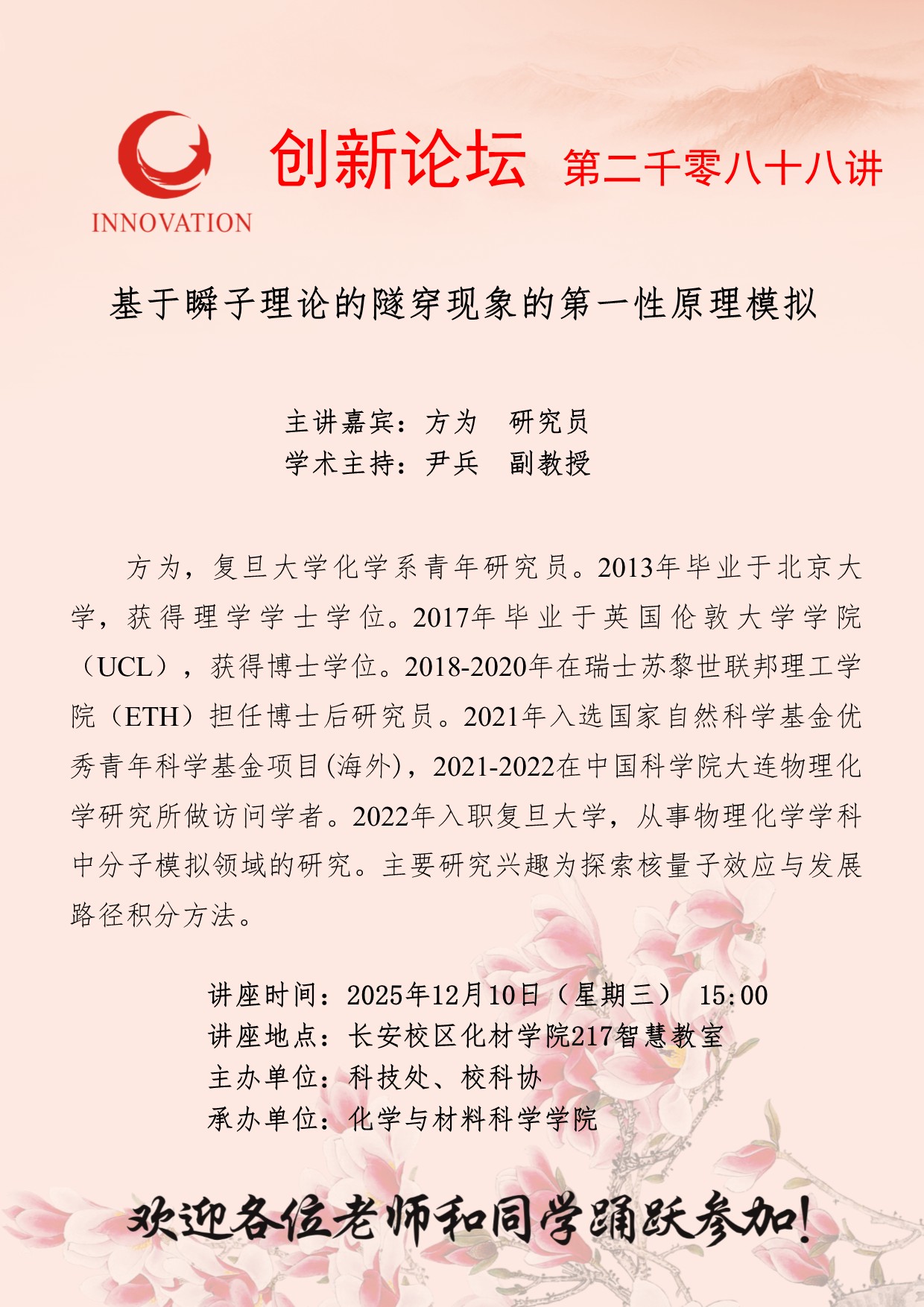 方为 研究员 日日躁夜夜躁狠狠久久AV创新论坛第二千零八十八讲:基于瞬子理论的隧穿现象的第一性原理模拟 讲座时间 2025年12月10日(星期三) 15:00 讲座地点 长安校区化材学院217智慧教室 讲座人介绍 方为 研究员 讲座内容