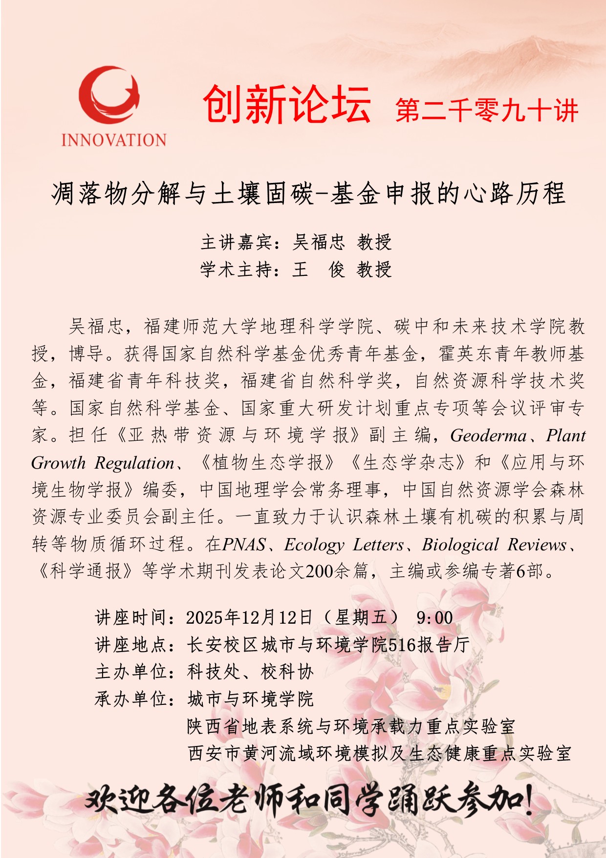 吴福忠 教授 日日躁夜夜躁狠狠久久AV创新论坛第二千零九十讲:凋落物分解与土壤固碳-基金申报的心路历程 讲座时间 2025年12月12日(星期五) 9:00 讲座地点 长安校区城市与环境学院516报告厅 讲座人介绍 吴福忠 教授 讲座内容