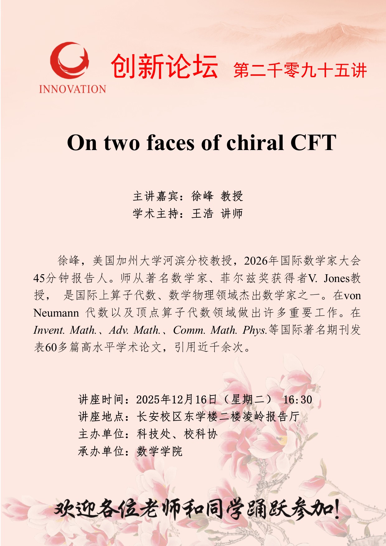 徐峰 教授 日日躁夜夜躁狠狠久久AV创新论坛第二千零九十五讲:On two faces of chiral CFT 讲座时间 2025年12月16日(星期二) 16:30 讲座地点 长安校区东学楼二楼凌岭报告厅 讲座人介绍 徐峰 教授 讲座内容