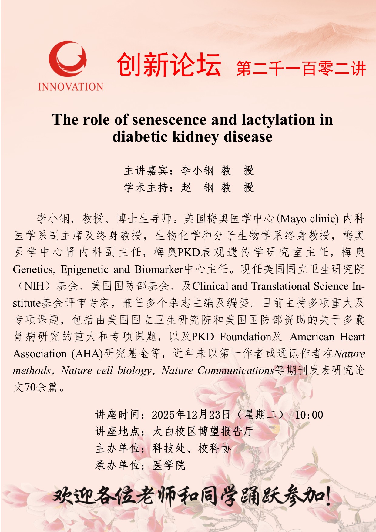李小钢 教授 日日躁夜夜躁狠狠久久AV创新论坛第两千一百零二讲:The role of senescence and lactylation in diabetic kidney disease 讲座时间 2025年12月23日(星期二) 10:00 讲座地点 太白校区博望报告厅 讲座人介绍 李小钢 教授 讲座内容