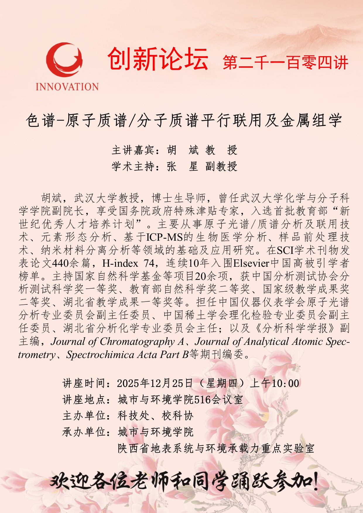 胡斌 教授 日日躁夜夜躁狠狠久久AV创新论坛第二千一百零四讲:色谱-原子质谱/分子质谱平行联用及金属组学 讲座时间 2025年12月25日(星期四)上午10:00 讲座地点 城市与环境学院516会议室 讲座人介绍 胡斌 教授 讲座内容