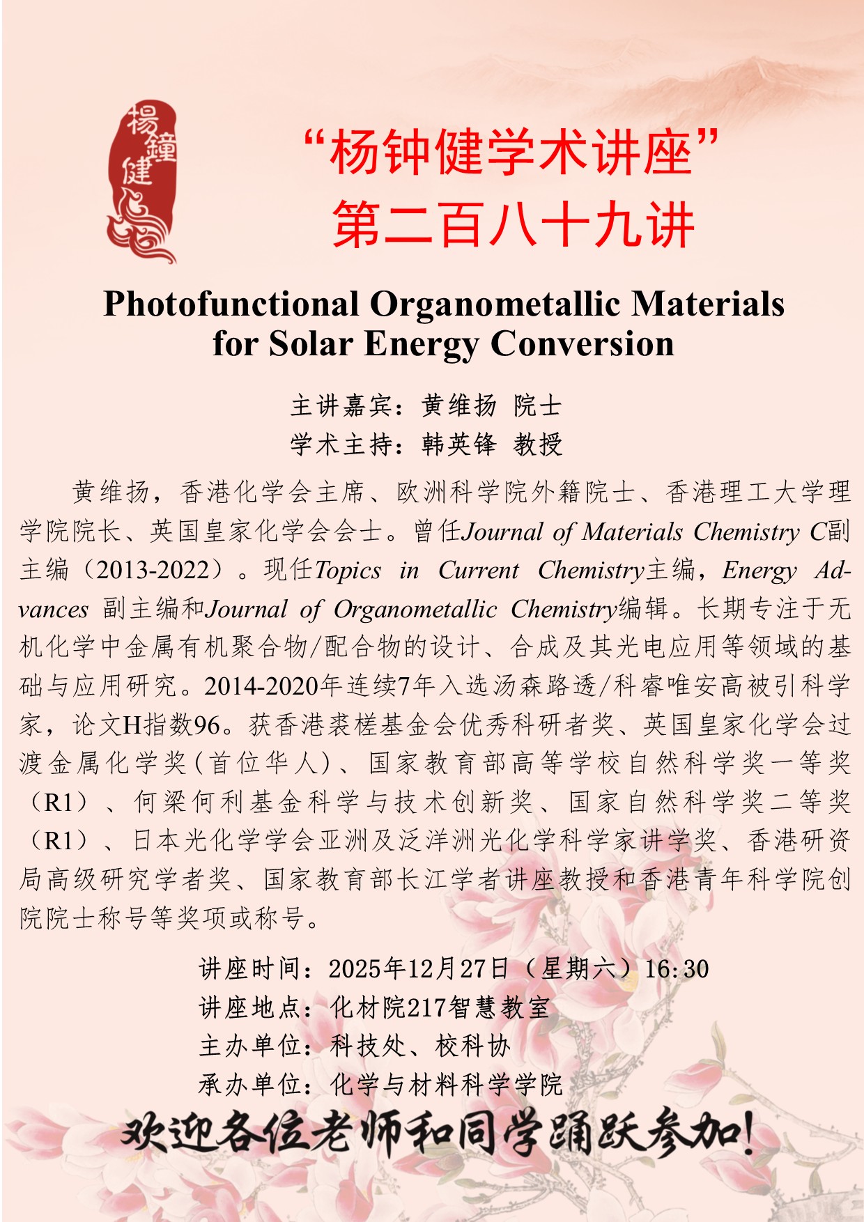 黄维扬 院士 “杨钟健学术讲座”第二百八十九讲:Photofunctional Organometallic Materials for Solar Energy Conversion 讲座时间 2025年12月27日(星期六)16:30 讲座地点 化材院217智慧教室 讲座人介绍 黄维扬 院士 讲座内容