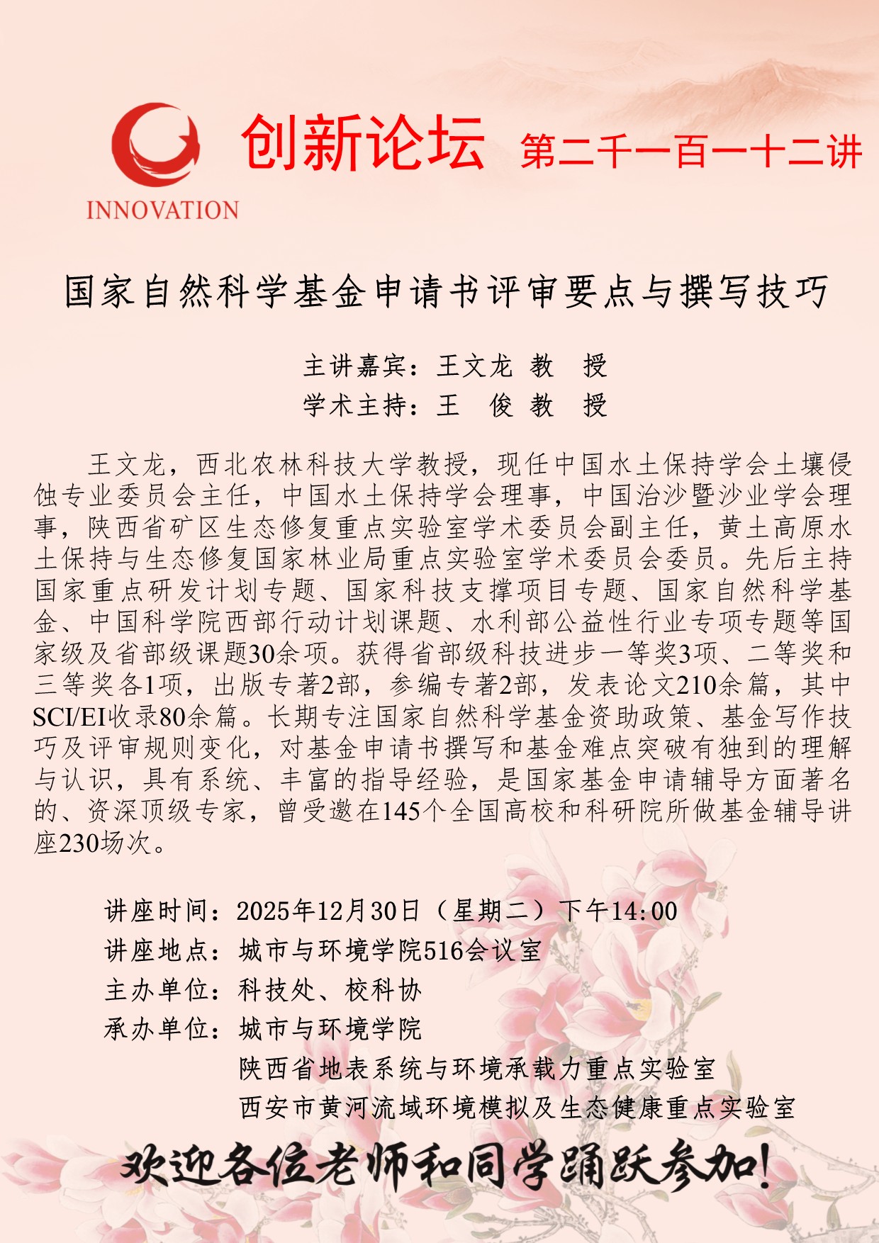 王文龙 教授 日日躁夜夜躁狠狠久久AV创新论坛第二千一百一十二讲:国家自然科学基金申请书评审要点与撰写技巧 讲座时间 2025年12月30日(星期二)下午14:00 讲座地点 城市与环境学院516会议室 讲座人介绍 王文龙 教授 讲座内容