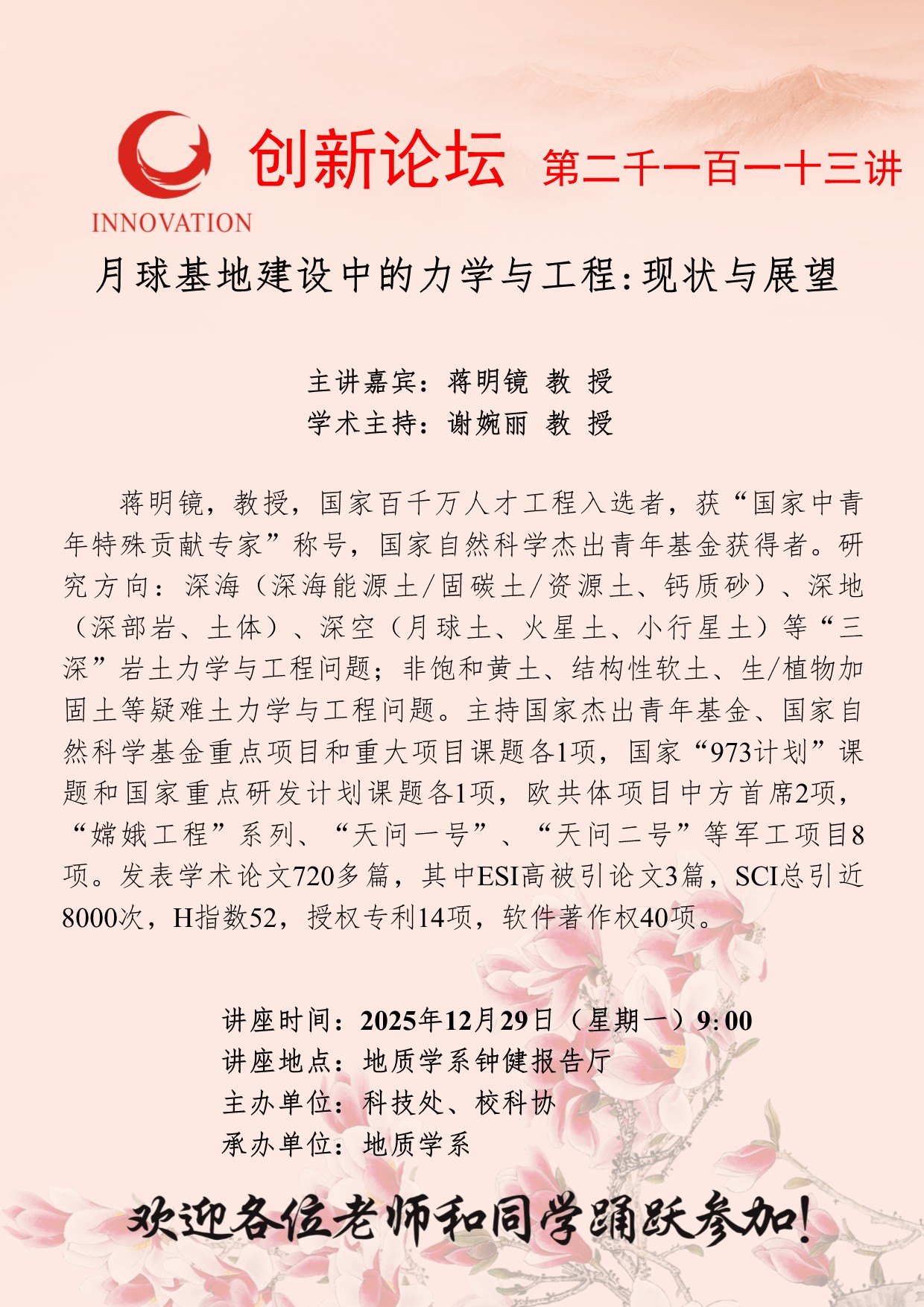 蒋明镜 教授 日日躁夜夜躁狠狠久久AV创新论坛第二千一百一十三讲:月球基地建设中的力学与工程:现状与展望 讲座时间 2025年12月29日(星期一)9:00 讲座地点 地质学系钟健报告厅 讲座人介绍 蒋明镜 教授 讲座内容