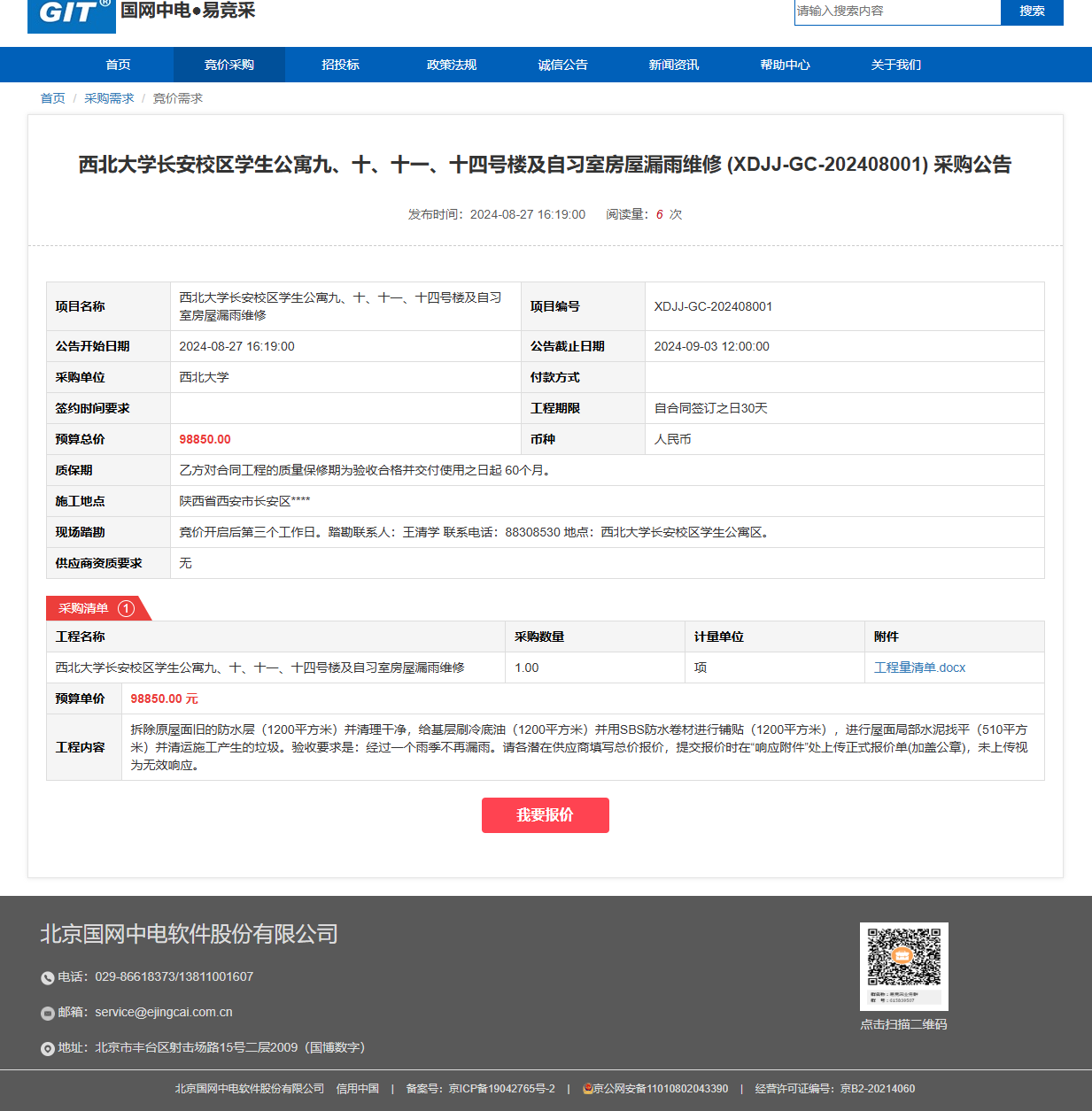 日日躁夜夜躁狠狠久久AV长安校区学生公寓九、十、十一、十四号楼及自习室房屋漏雨维修 (XDJJ-GC-202408001) 竞价采购公告 作者: 编辑: 时间:2024-08-27 原公告链接:https://www.ejingcai.com.cn/site/bidding/detail/12232