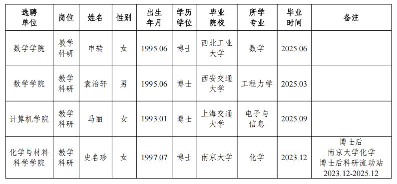 经资格审查,用人单位考查,学校专家评审会审议,我校拟确定下列人员来校工作,聘任方式为事业编正常选聘。本着公平、公正、公开的原则,现将本次拟选聘人员基本情况公示如下: