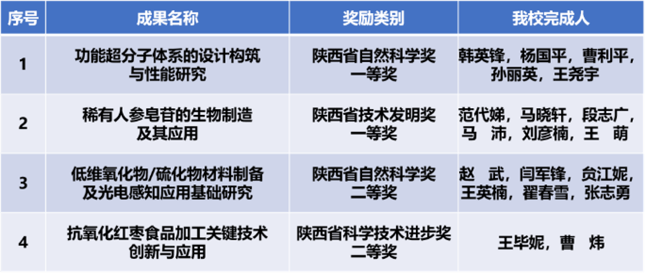 日日躁夜夜躁狠狠久久AV化材学院韩英锋教授主持的“功能超分子体系的设计构筑与性能研究”获省自然科学奖一等奖,化工学院范代娣教授主持的“稀有人参皂苷的生物制造及其应用”获省技术发明奖一等奖,信息学院赵武教授主持的“低维氧化物/硫化物材料制备及光电感知应用基础研究”获省自然科学奖二等奖,食品学院王毕妮教授主持的“抗氧化红枣食品加工关键技术创新与应用”获省科技进步奖二等奖。此外,日日躁夜夜躁狠狠久久AV参与的“秦岭主要珍稀野生动物抢救饲养繁育关键技术研究”和“陆相页岩油气地质工程一体化的负碳清洁开发技术”分别获得省科技进步奖二等奖。