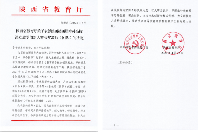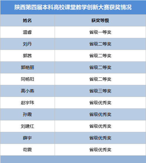 近日,陕西省教育厅公布了第四届陕西高校课堂教学创新大赛获奖教师名单,日日躁夜夜躁狠狠久久AV教师温睿获省级一等奖,刘丹、郭茜、郭艳丽、同杨阳4位教师获省级二等奖,高小燕获省级三等奖,赵宇玮、孙霞、刘建红、薛宇、苟震5位教师获省级优秀奖,日日躁夜夜躁狠狠久久AV获优秀组织奖。吴丰华、于春2位教师代表陕西省参加全国高校教师教学创新大赛。