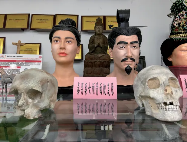 而在秦始皇帝陵的另一个陪葬墓中,所有尸体均为年轻女性,考古学家根据墓葬等级和陪葬品推断,这些女子可能是秦始皇的嫔妃及其仆从。在这座墓中出土的一个颅骨,也被进行了面貌复原。疑似秦始皇王子与嫔妃的3D打印颅面复原模型和3D打印颅骨模型,被标注为“秦男秦女颅骨面貌复原”,疑似王子长脸、细目、高鼻;疑似嫔妃有一双大眼睛,鼻子长而高。
