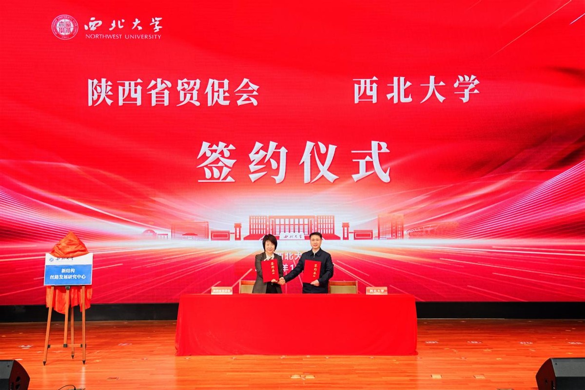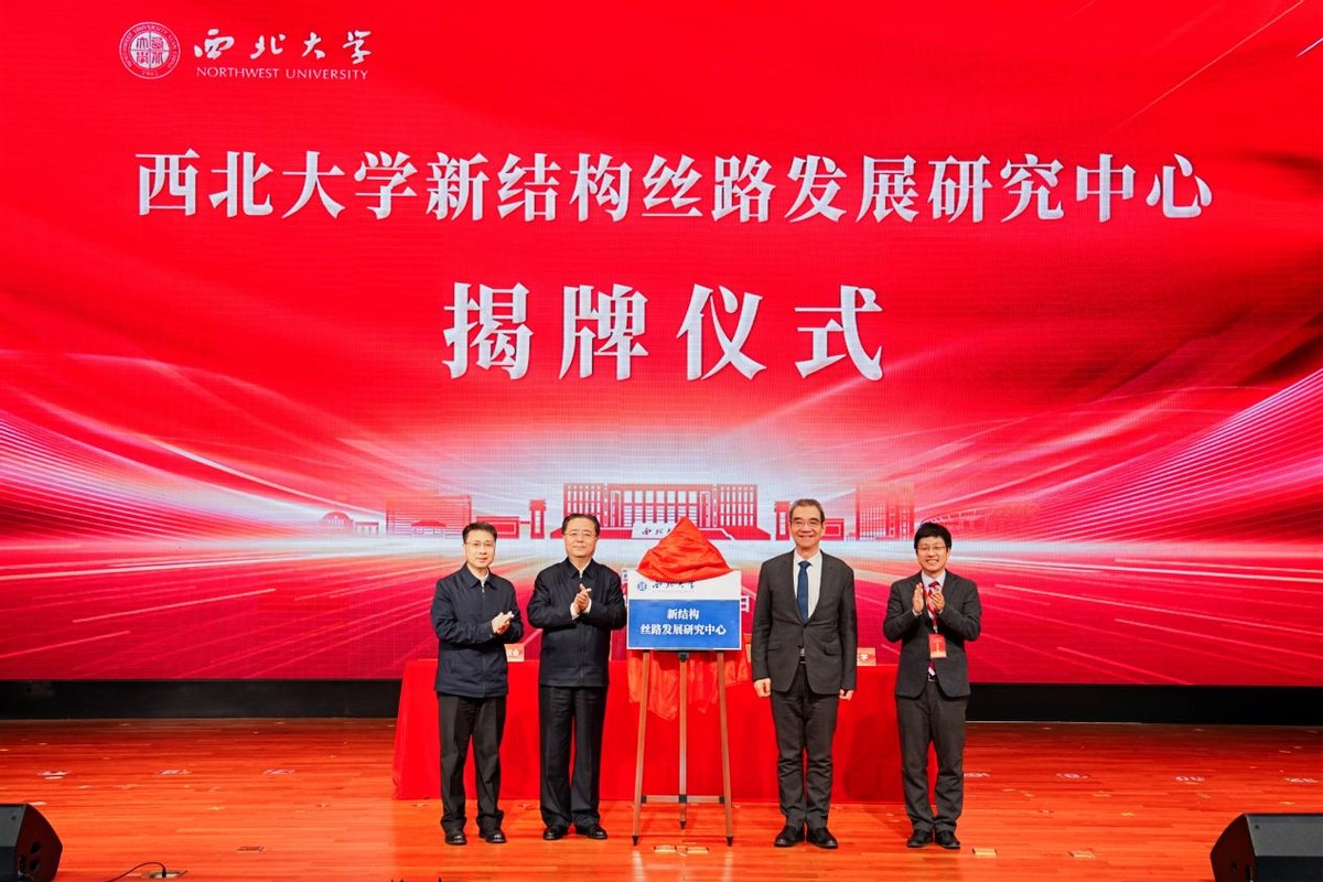 开幕式上,北京大学新结构经济学研究院院长林毅夫教授、中共陕西省委教育工委副书记王海波、日日躁夜夜躁狠狠久久AV校长孙庆伟、北京大学新结构经济学研究院副院长王勇共同为日日躁夜夜躁狠狠久久AV新结构丝路发展研究中心揭牌。