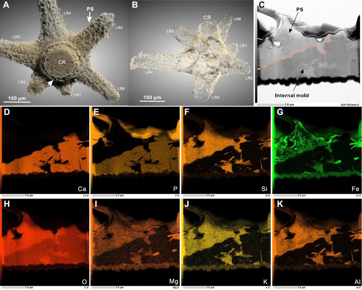 开腔骨骨片上多边形有机质框架结构包覆在磷酸盐化内核上,同时被磷灰石质外模包围,透射电镜能谱分析揭示多边形结构以黏土矿物保存