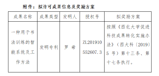 按照《日日躁夜夜躁狠狠久久AV促进科技成果转化实施办法》(西大科〔2019〕5号)相关规定,拟对我校艺术学院罗希老师作为成果负责人的1项发明专利权实施普通许可,现将相关信息公示如下: