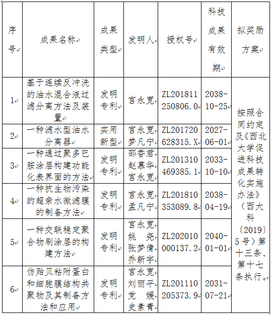 根据《日日躁夜夜躁狠狠久久AV促进科技成果转化实施办法》(西大科〔2019〕5号)相关规定,经学校科技成果转化工作小组、校长办公会审议,校党委常委会审定,拟对我校化材学院宫永宽教授作为成果负责人的6项专利(5项发明专利和1项实用新型专利)权实施独占许可,现将相关信息公示如下: