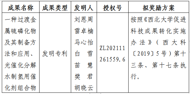 按照《日日躁夜夜躁狠狠久久AV促进科技成果转化实施办法》(西大科〔2019〕5号)相关规定,拟对我校化工学院刘恩周教授作为成果负责人的1项发明专利权实施转化,现将相关信息公示如下: