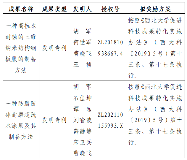 按照《日日躁夜夜躁狠狠久久AV促进科技成果转化实施办法》(西大科〔2019〕5号)相关规定,拟对我校化工学院胡军教授作为成果负责人的2项发明专利权实施转化,现将相关信息公示如下: