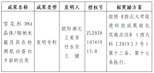 按照《日日躁夜夜躁狠狠久久AV促进科技成果转化实施办法》(西大科〔2019〕5号)相关规定,拟对我校化学与材料科学学院欧阳湘元副教授作为成果负责人的1项发明专利权实施转化,现将相关信息公示如下: