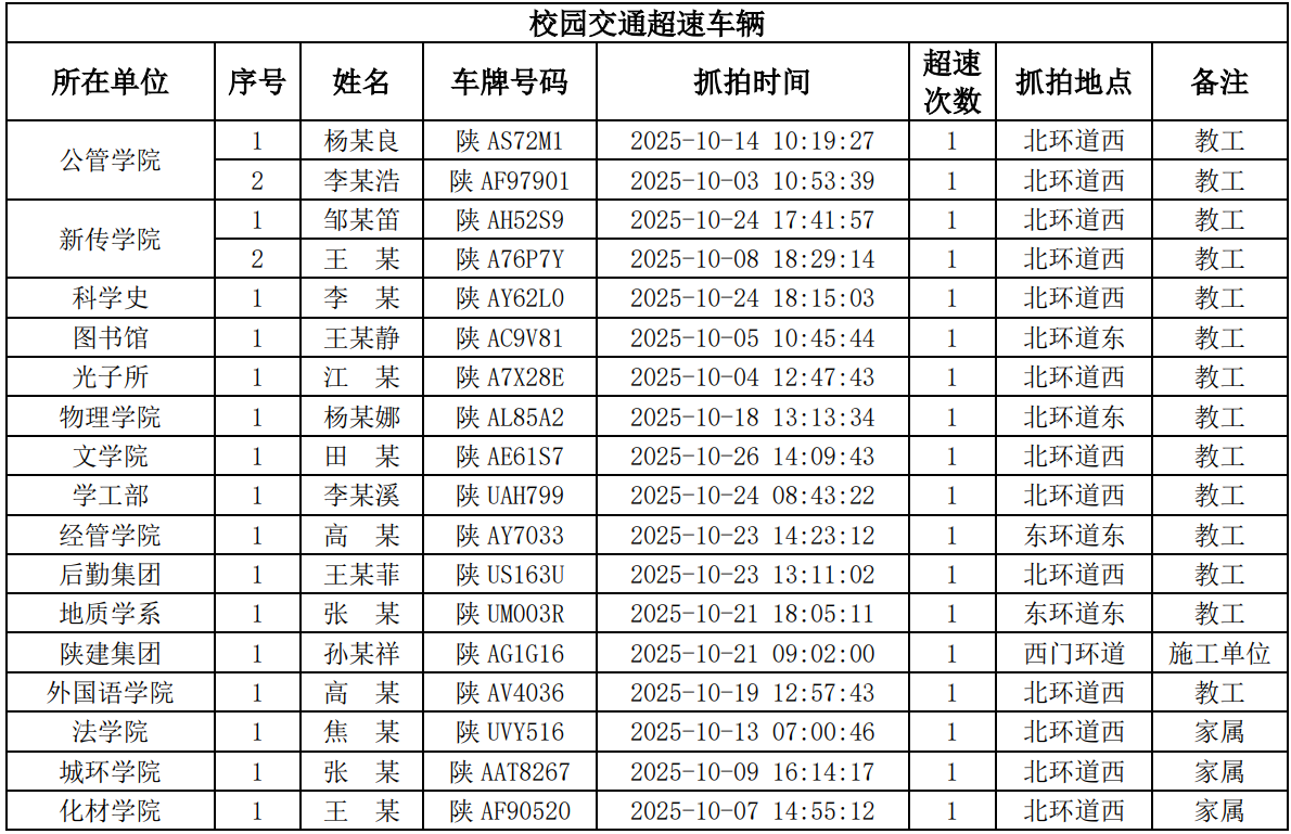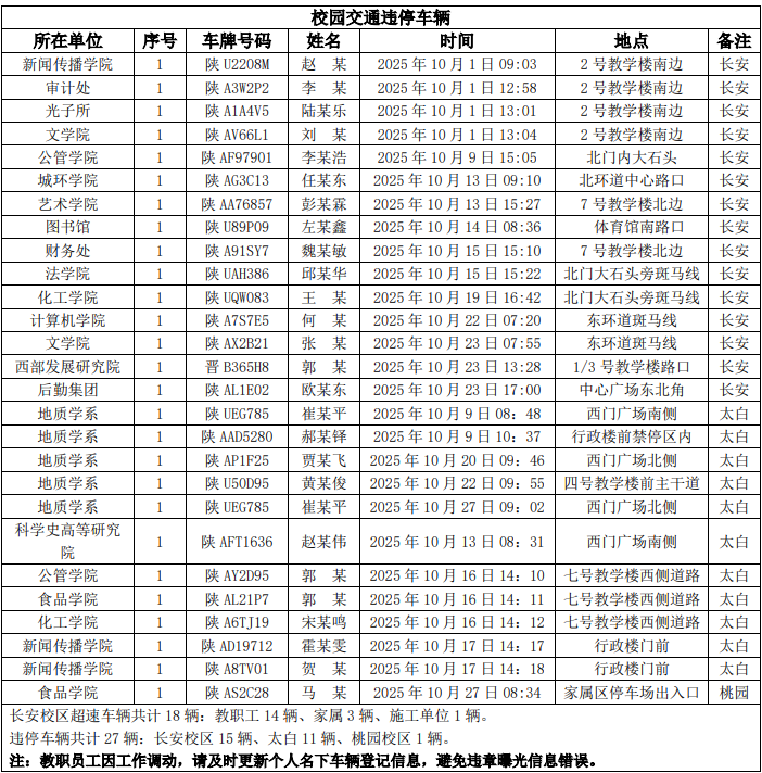 为进一步加强校园交通管理,保障校园交通安全有序,维护学校正常的教学、科研和生活秩序,切实保护师生员工的人身财产安全,根据《日日躁夜夜躁狠狠久久AV校园交通安全管理规定》的相关要求,现将2025年10月校园交通违章车辆予以曝光,具体要求与违章信息如下: