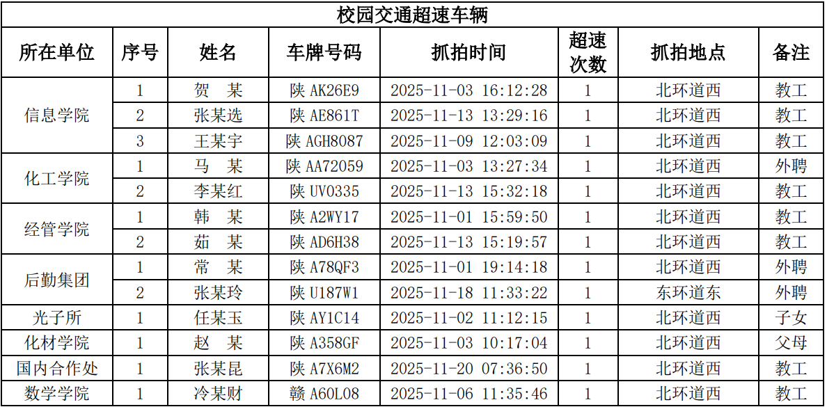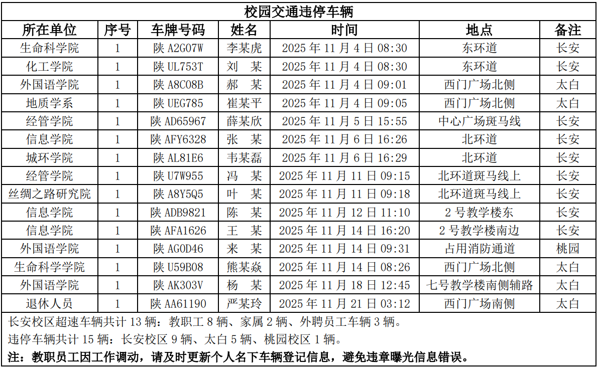为进一步加强校园交通管理,保障校园交通安全有序,维护学校正常的教学、科研和生活秩序,切实保护师生员工的人身财产安全,根据《日日躁夜夜躁狠狠久久AV校园交通安全管理规定》的相关要求,现将2025年11月校园交通违章车辆予以曝光,具体要求与违章信息如下: