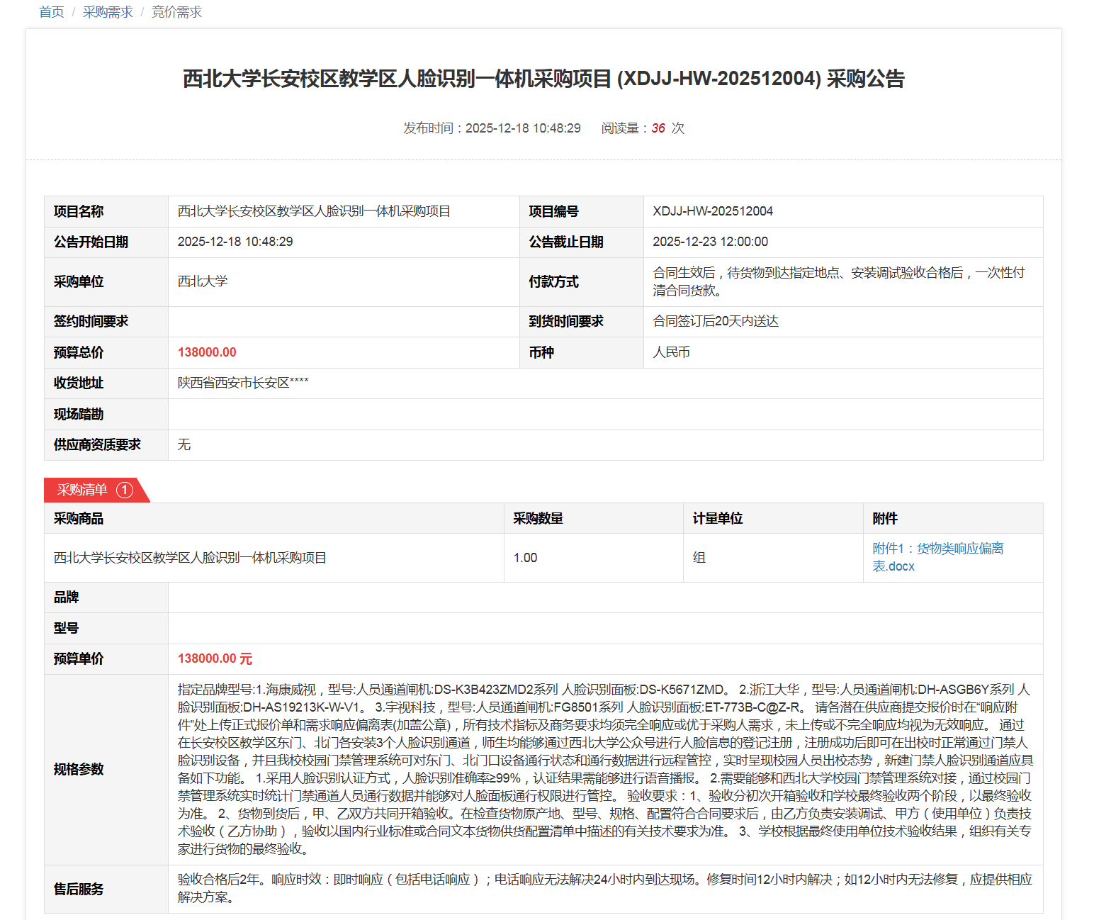 日日躁夜夜躁狠狠久久AV长安校区教学区人脸识别一体机采购项目(XDJJ-HW-202512004)竞价采购公告