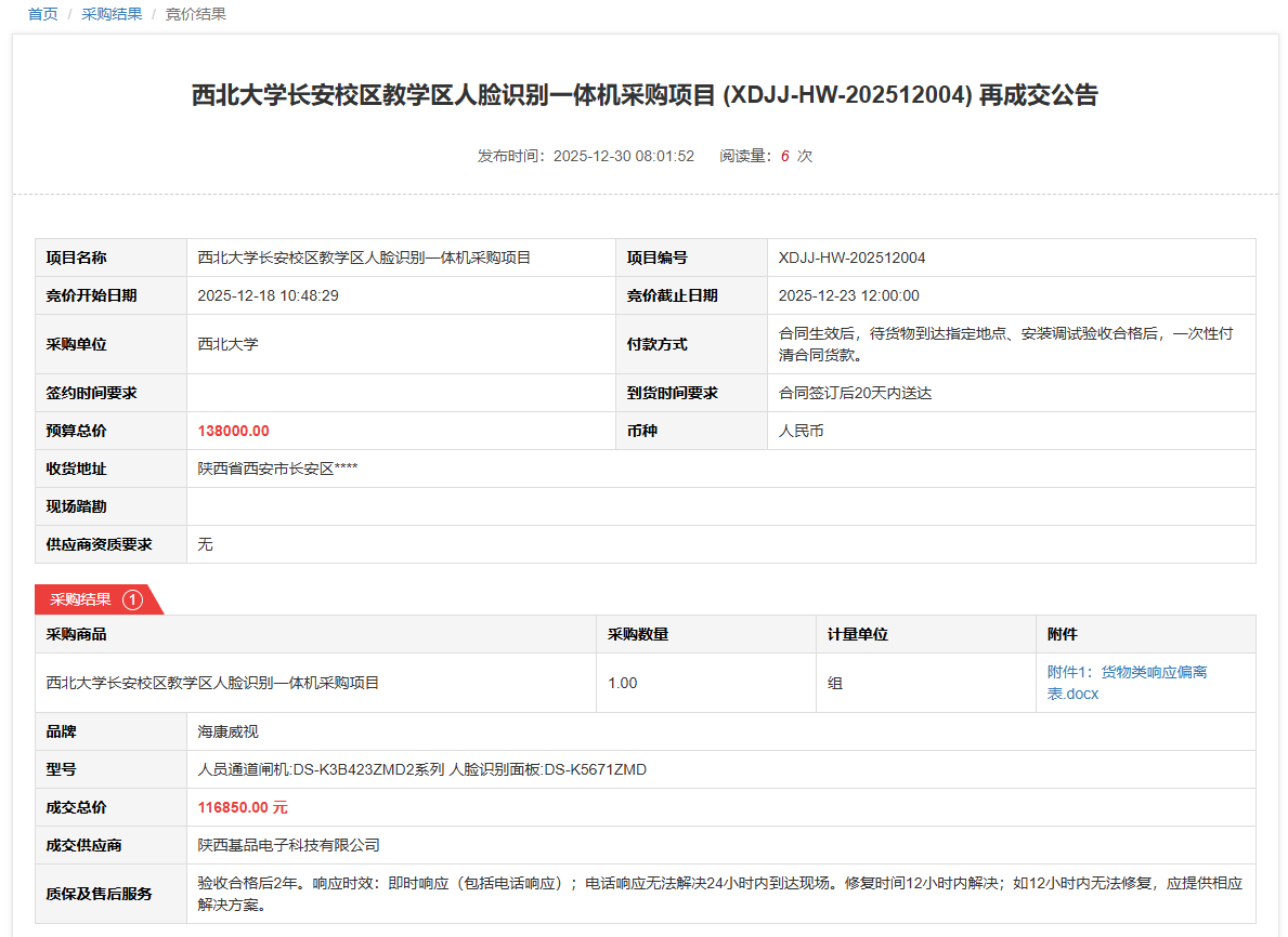 日日躁夜夜躁狠狠久久AV长安校区教学区人脸识别一体机采购项目(XDJJ-HW-202512004)竞价再成交公告